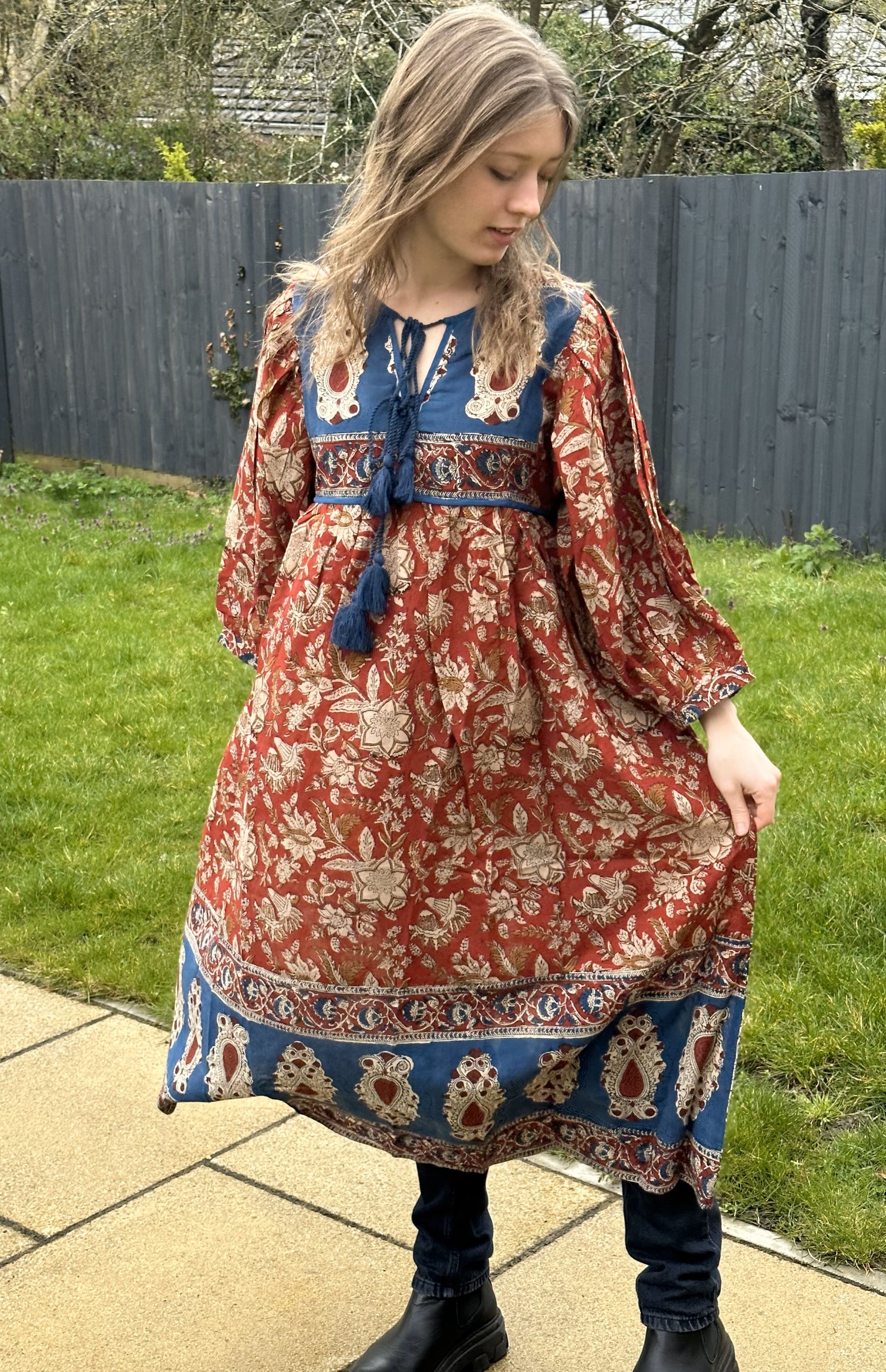 The "Ananda" dress is a limited edition, handcrafted Bohemian-style midi dress featuring a bold red base with royal blue paisleys, block printed using plant-based dyes. Its flowing silhouette, lightweight fabric, and breathable design make it ideal for hot summer days, offering comfort and elegance. A unique blend of traditional craftsmanship and modern style, it's the perfect statement piece for any summer occasion.