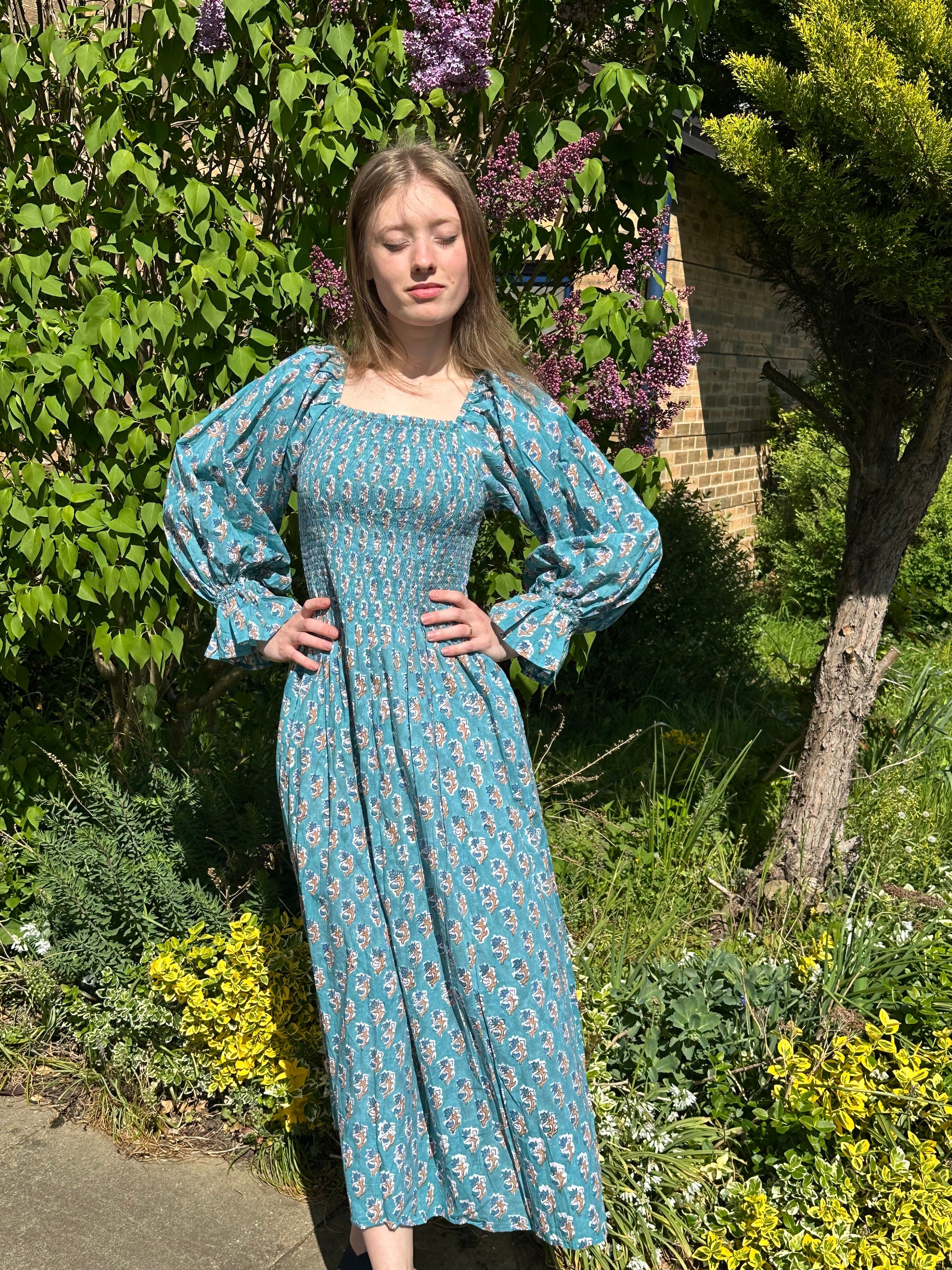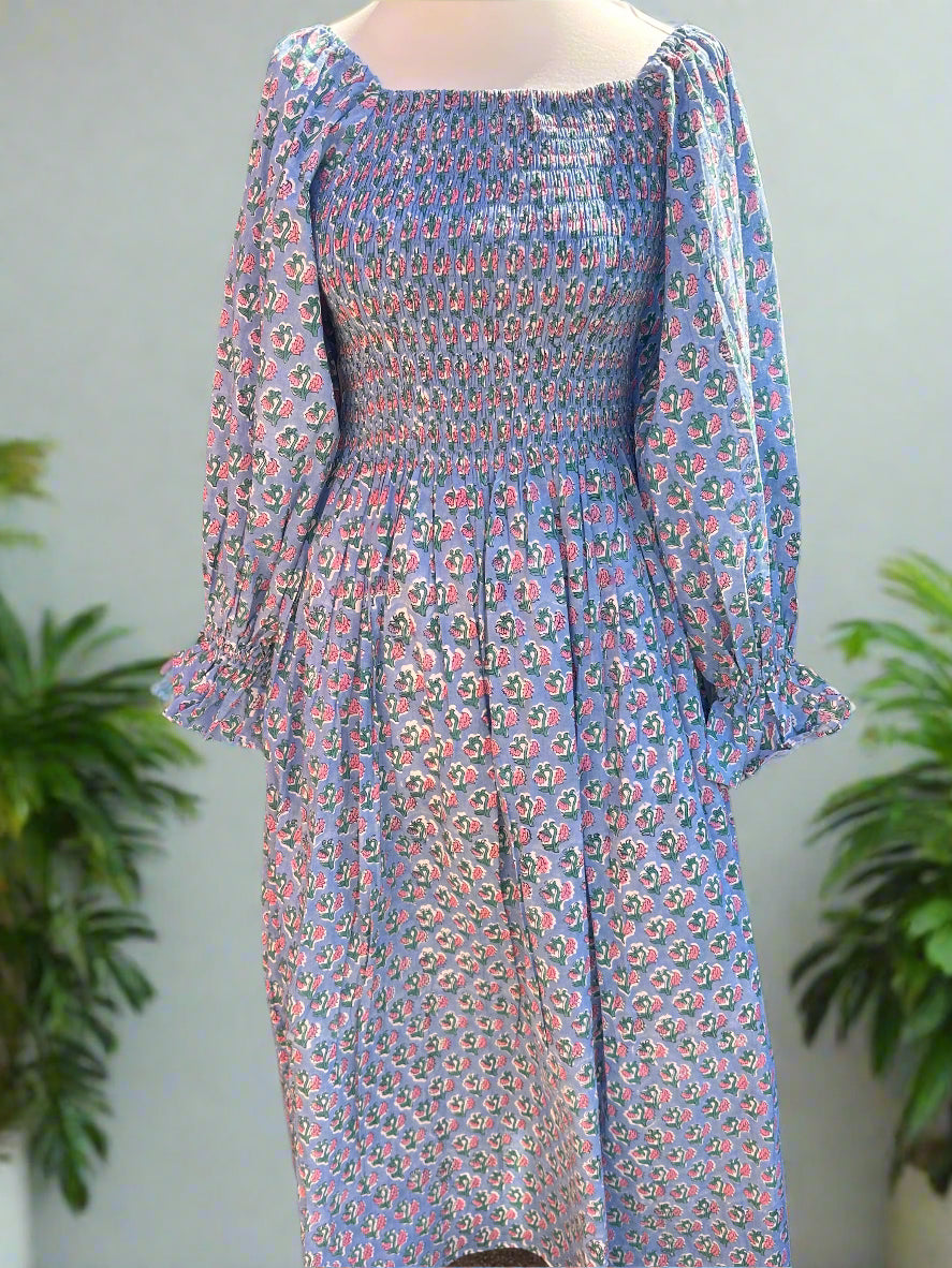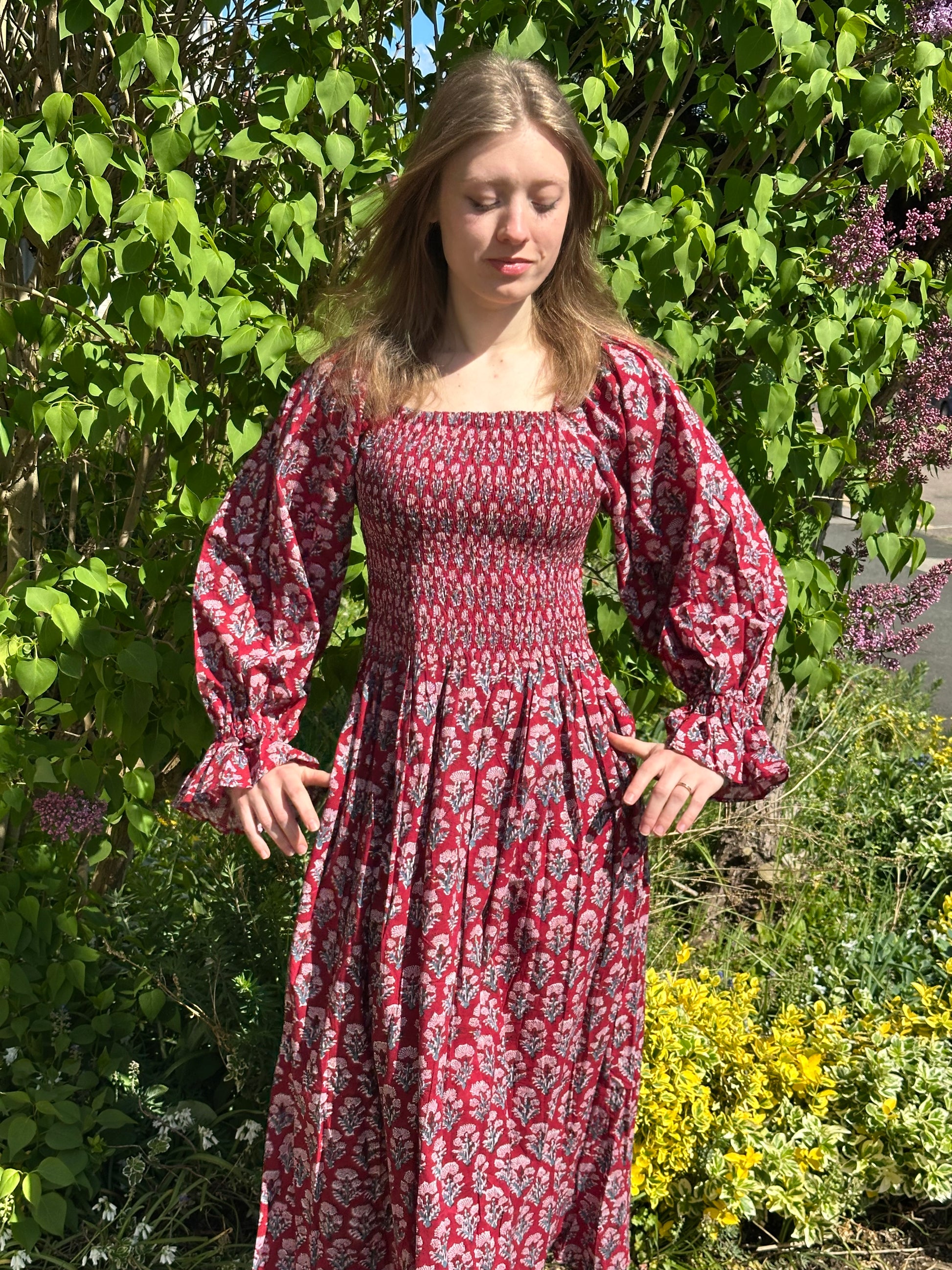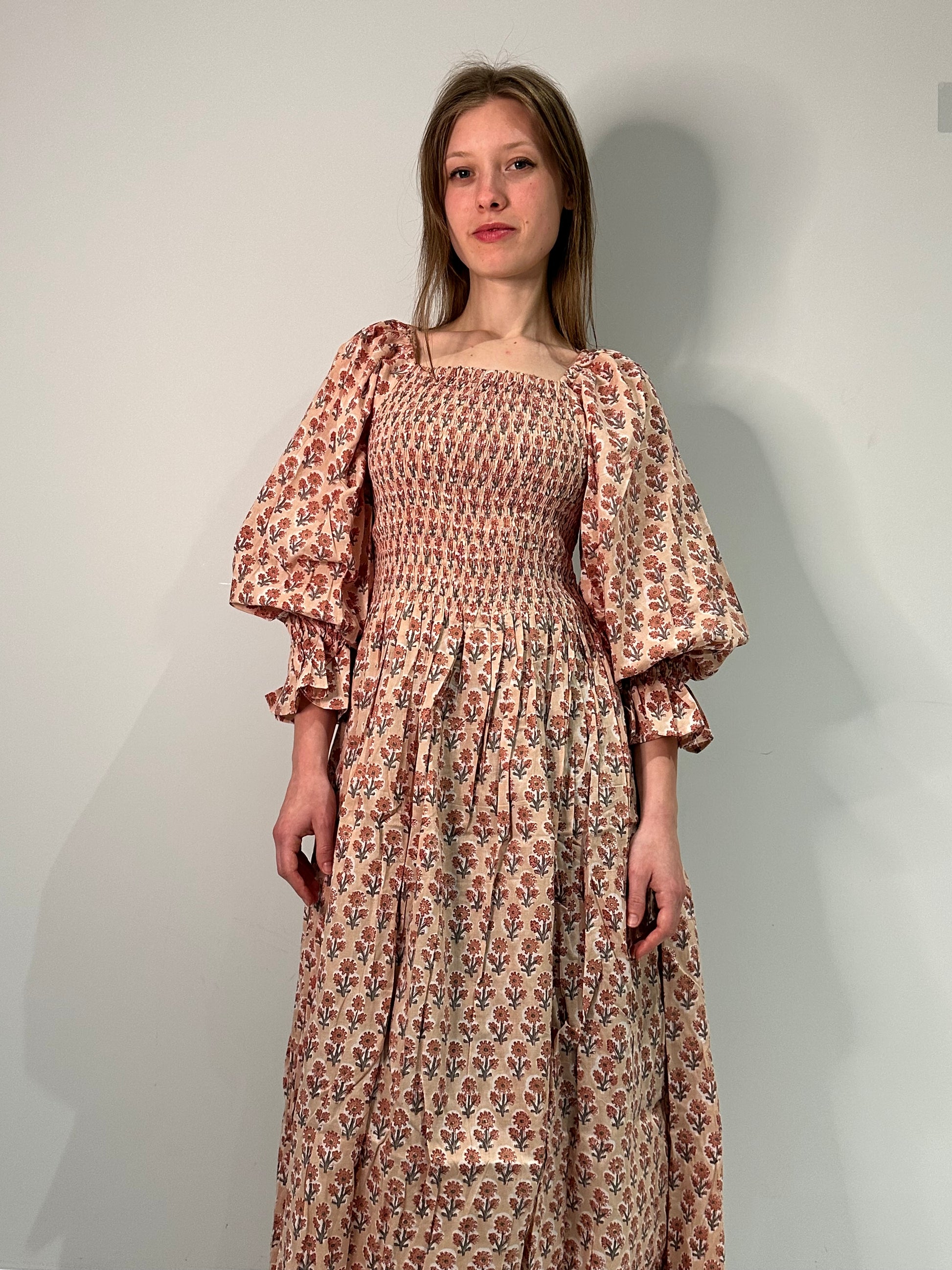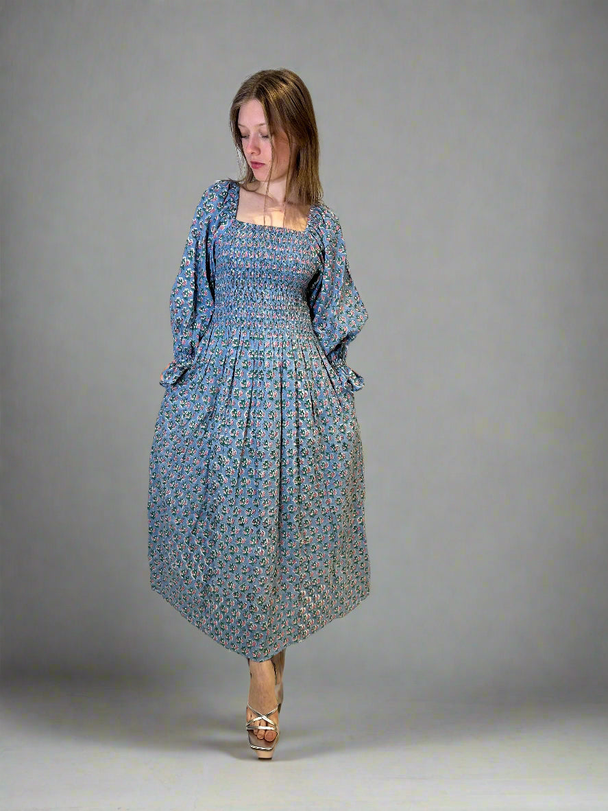 Romantic, easy, and effortlessly flattering. This one-size shirred maxi dress features a square neckline, voluminous sleeves, and a fully elasticated bodice that stretches to fit and flatter a range of shapes. Made from soft, breathable cotton and available in four vintage-inspired floral prints. Dress it up with heels or keep it casual with sandals – either way, it’s a wardrobe staple.