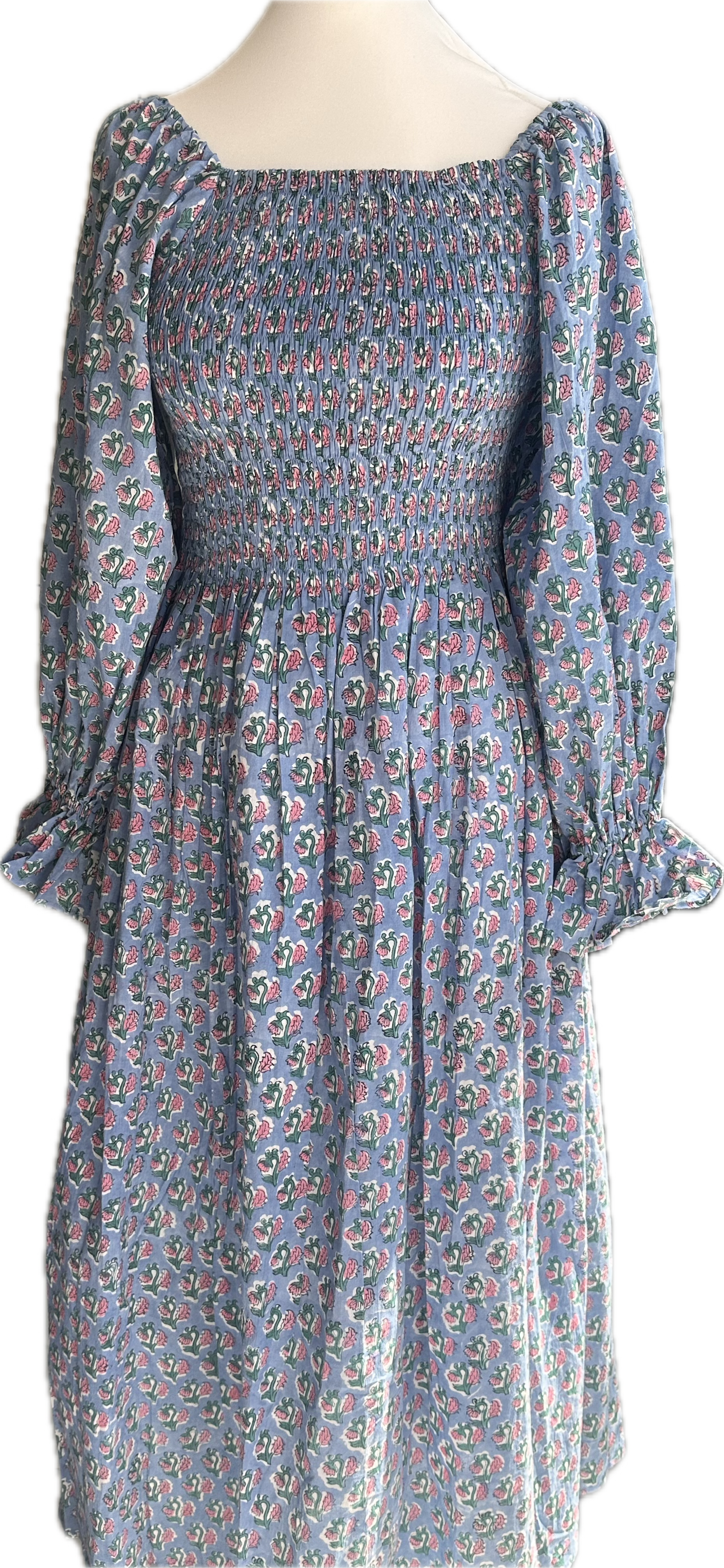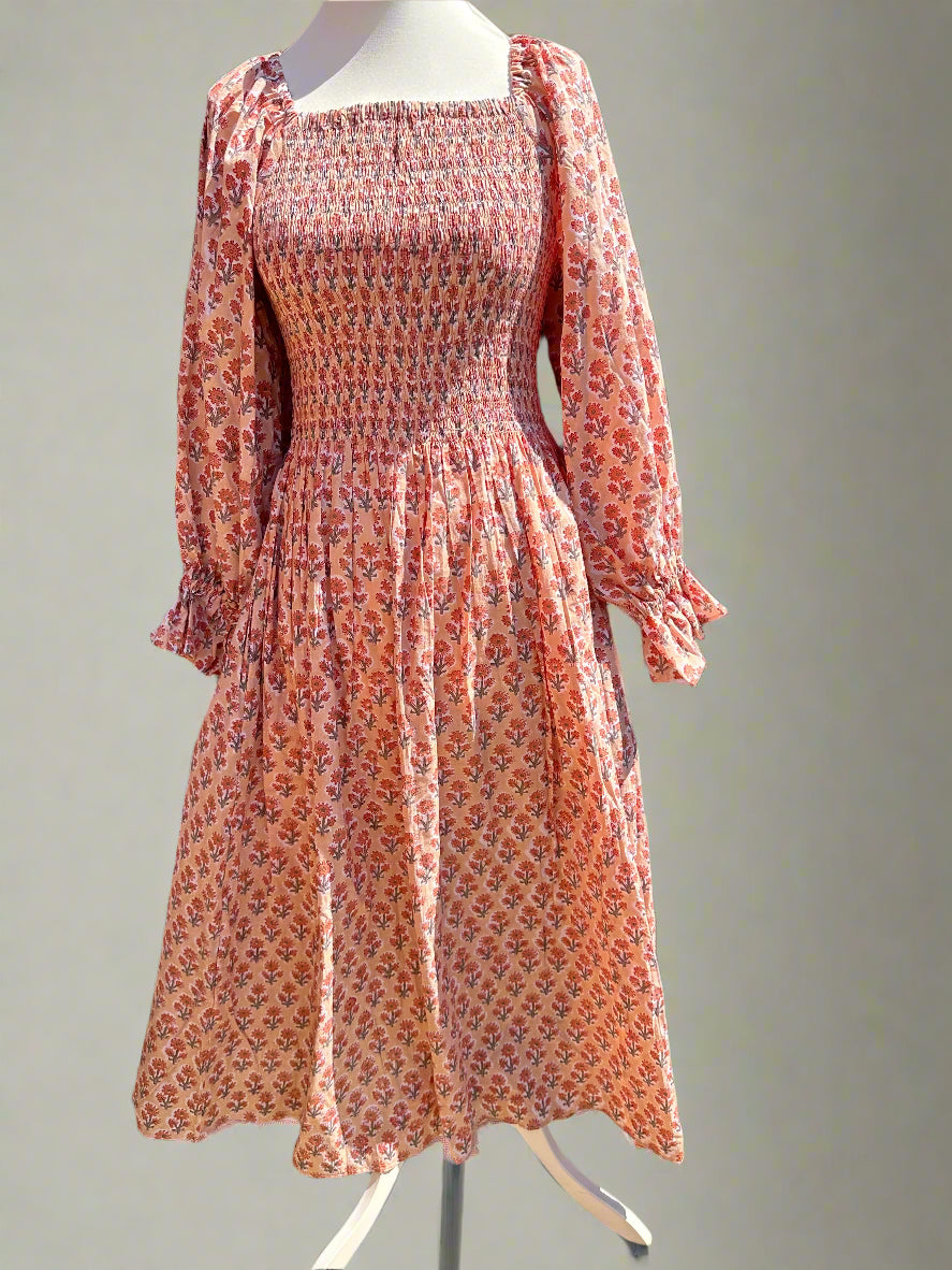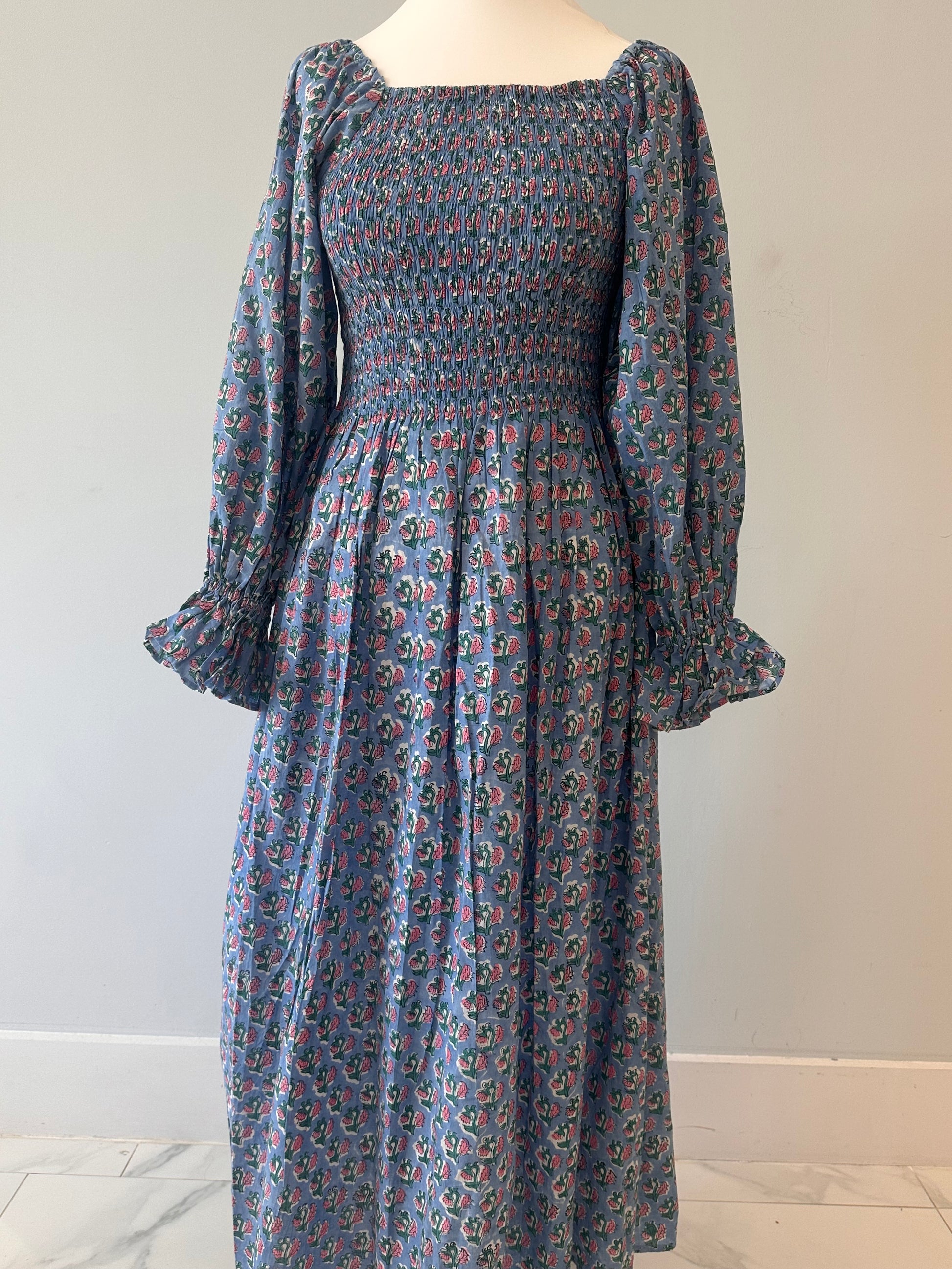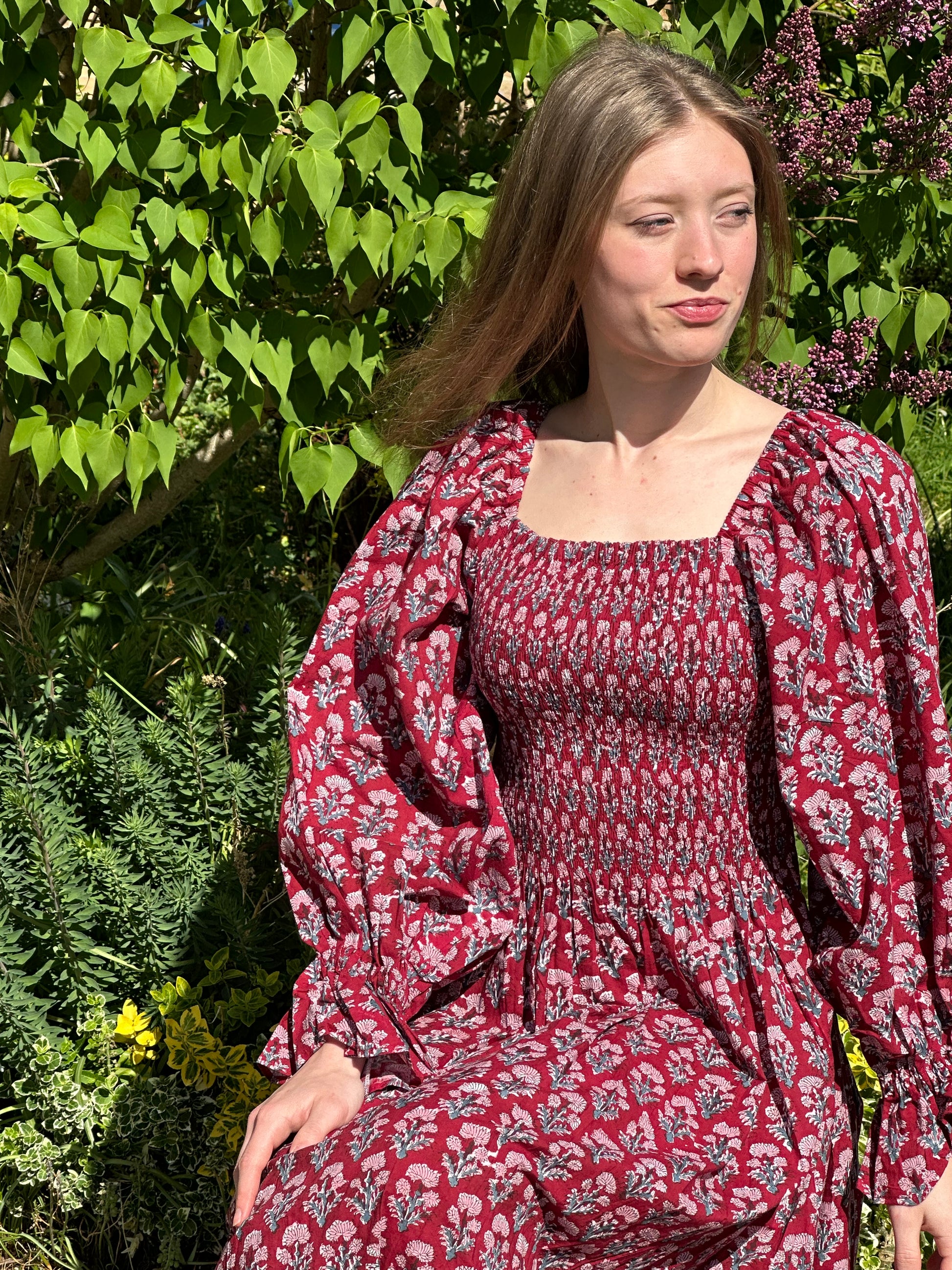 Romantic, easy, and effortlessly flattering. This one-size shirred maxi dress features a square neckline, voluminous sleeves, and a fully elasticated bodice that stretches to fit and flatter a range of shapes. Made from soft, breathable cotton and available in four vintage-inspired floral prints. Dress it up with heels or keep it casual with sandals – either way, it’s a wardrobe staple.