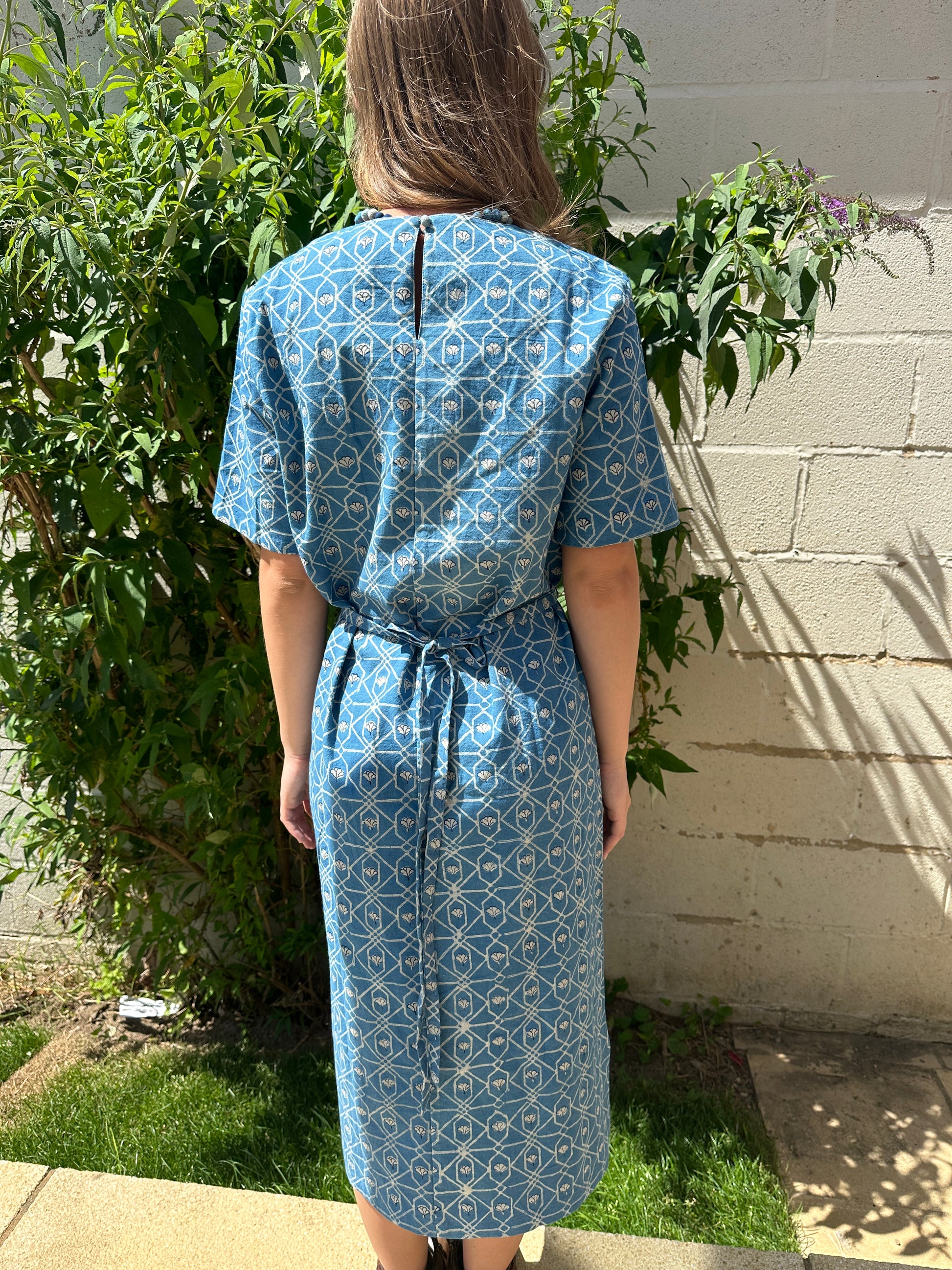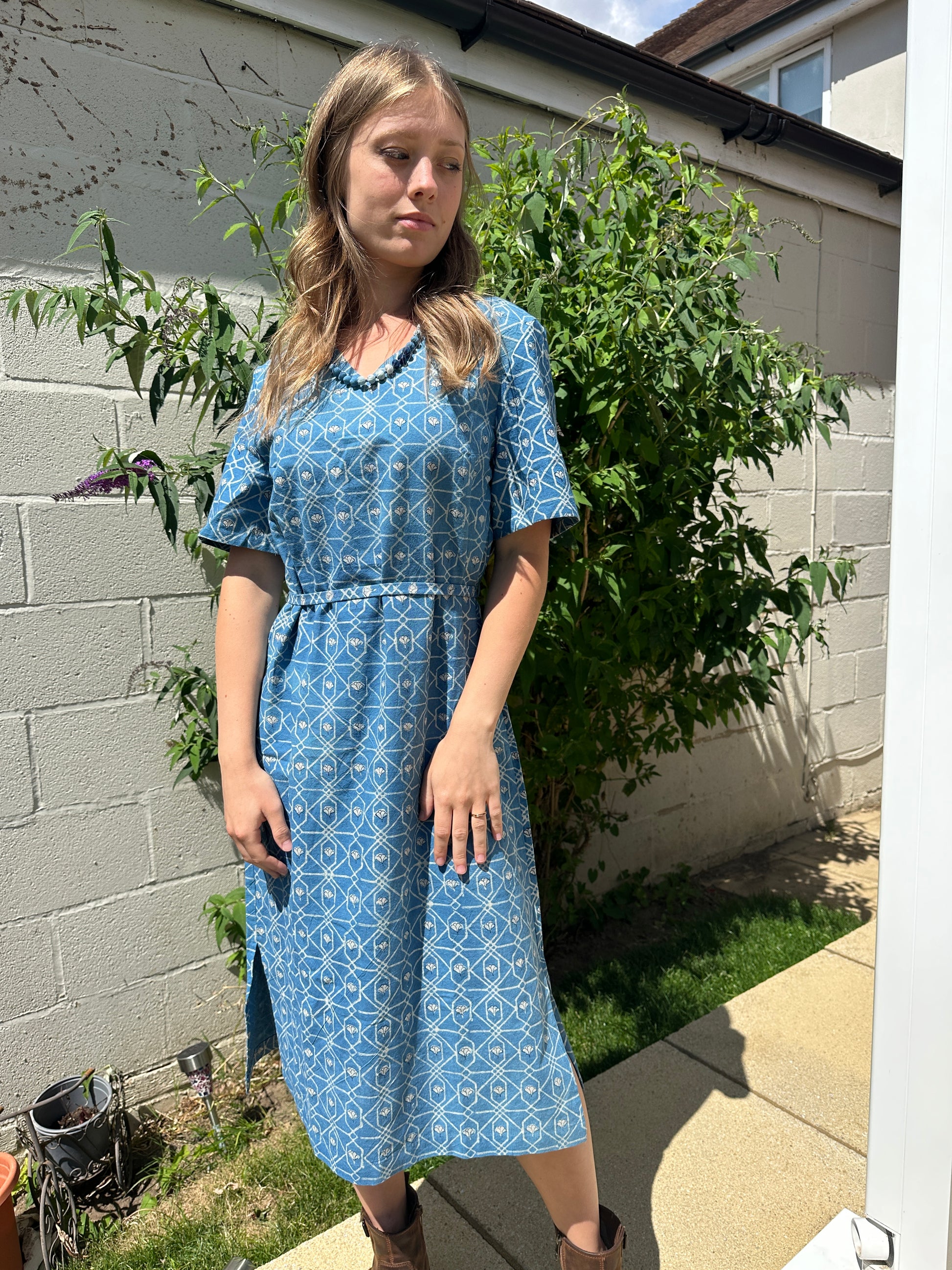 This indigo-dyed Dabu hand block printed long cotton dress in light blue exudes effortless elegance and comfort. Featuring a waist belt that cinches the silhouette and side slits for ease of movement, this dress combines traditional craftsmanship with a modern twist. Perfect for a relaxed yet refined look, it's a versatile piece that showcases artisanal beauty while keeping you stylish and comfortable.