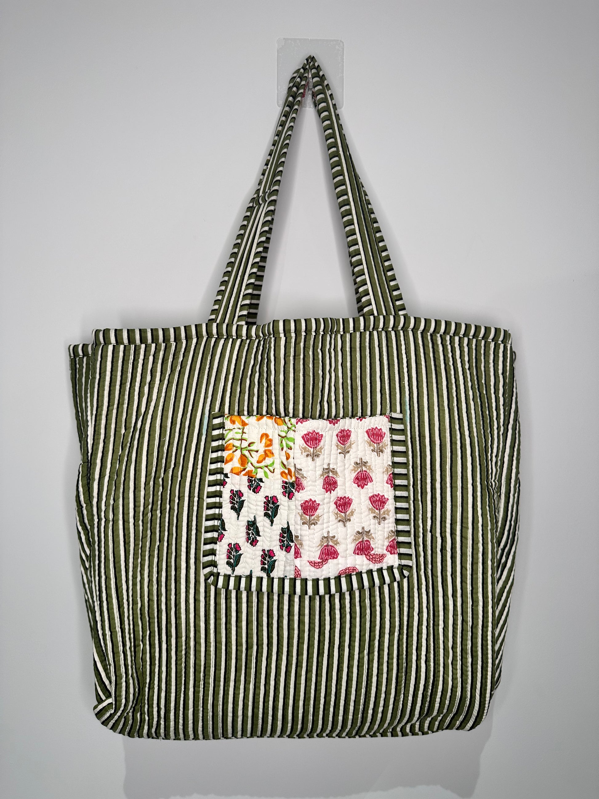 Travel sustainably in style with our one-of-a-kind handmade quilted tote bags, carefully crafted using unique patchwork designs that reuse cotton fabric scraps where possible, reducing waste. Note the reversible design and large size, making this bag not only versatile but also stylish and multi-use. The pocket can feature either on the outside or inside of the bag depending on which pattern you wish to show off!