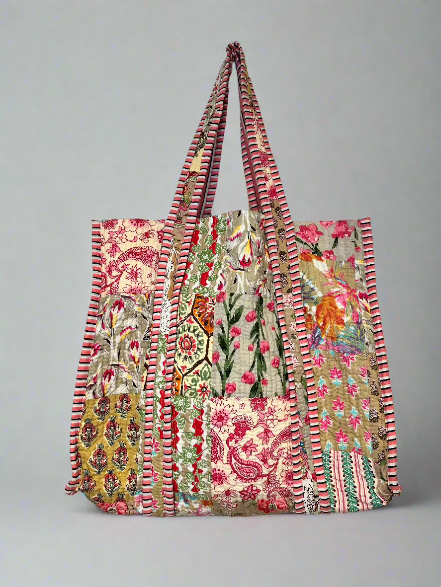 Travel sustainably in style with our one-of-a-kind handmade quilted tote bags, carefully crafted using unique patchwork designs that reuse cotton fabric scraps where possible, reducing waste. Note the reversible design and large size, making this bag not only versatile but also stylish and multi-use. The pocket can feature either on the outside or inside of the bag depending on which pattern you wish to show off!