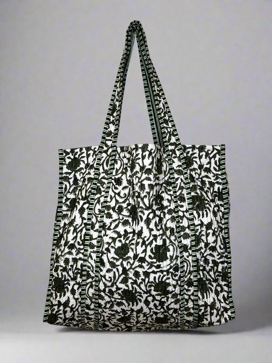 Travel sustainably in style with our one-of-a-kind handmade quilted tote bags, carefully crafted using unique patchwork designs that reuse cotton fabric scraps where possible, reducing waste. Note the reversible design and large size, making this bag not only versatile but also stylish and multi-use. The pocket can feature either on the outside or inside of the bag depending on which pattern you wish to show off!