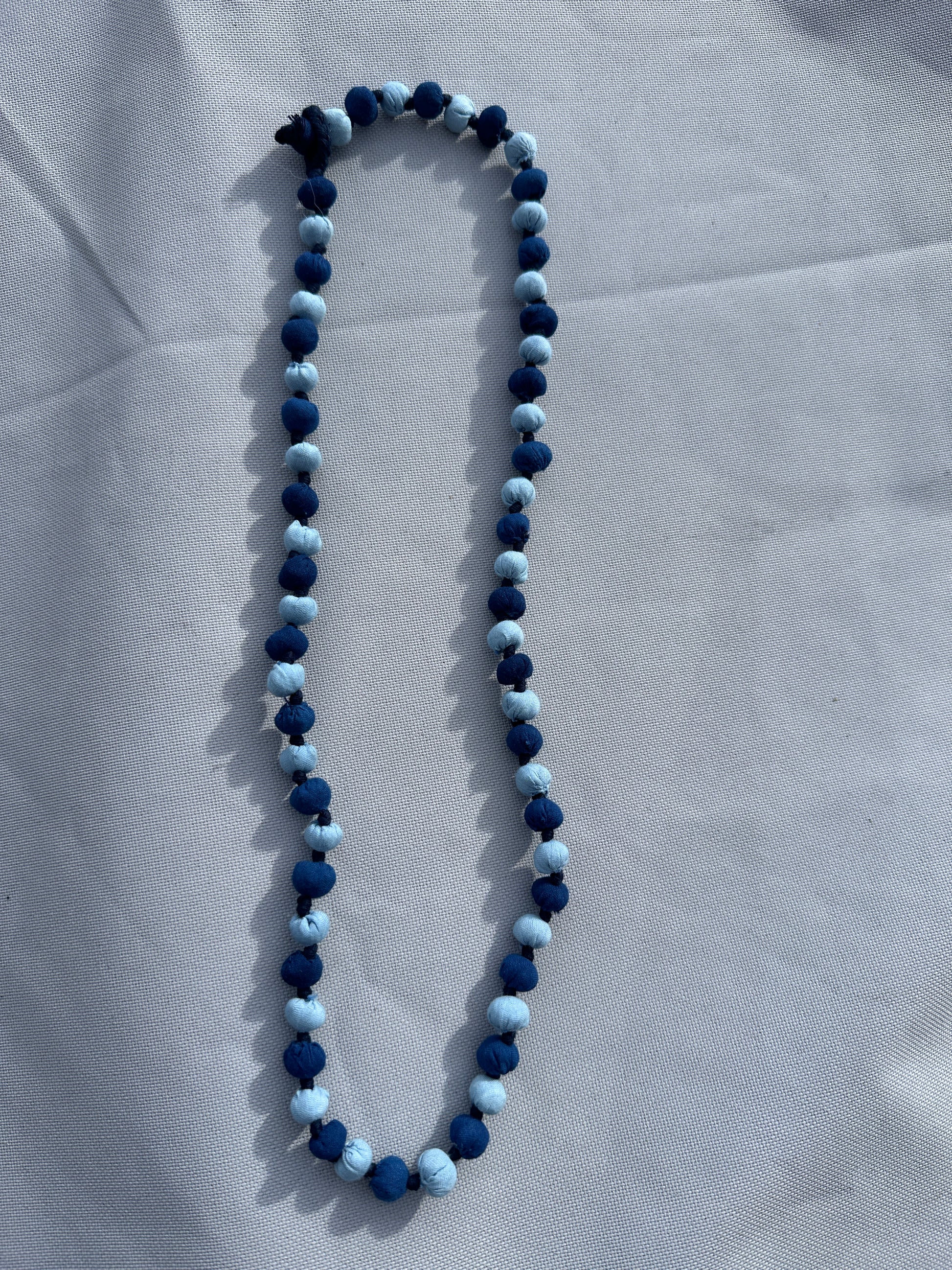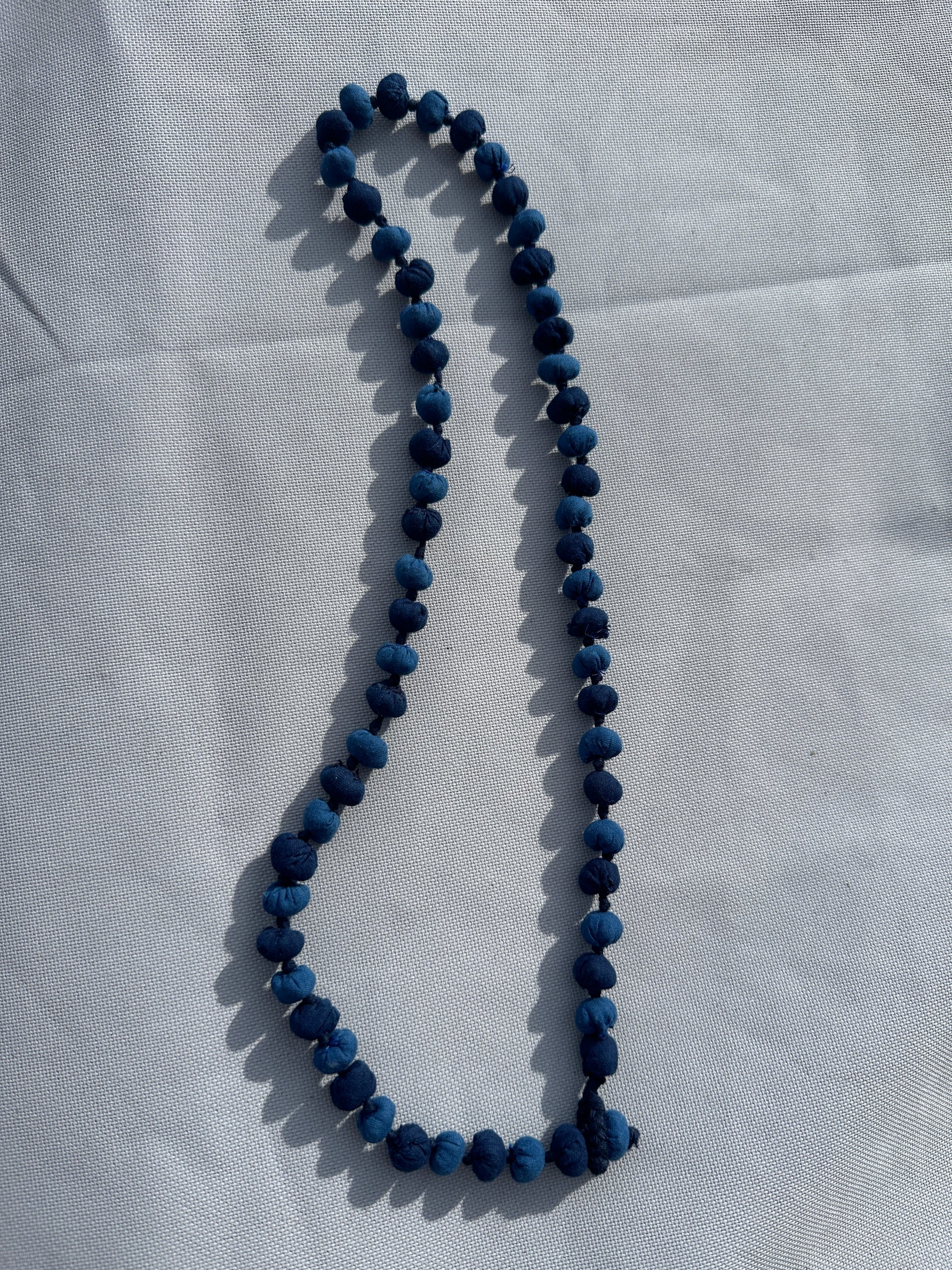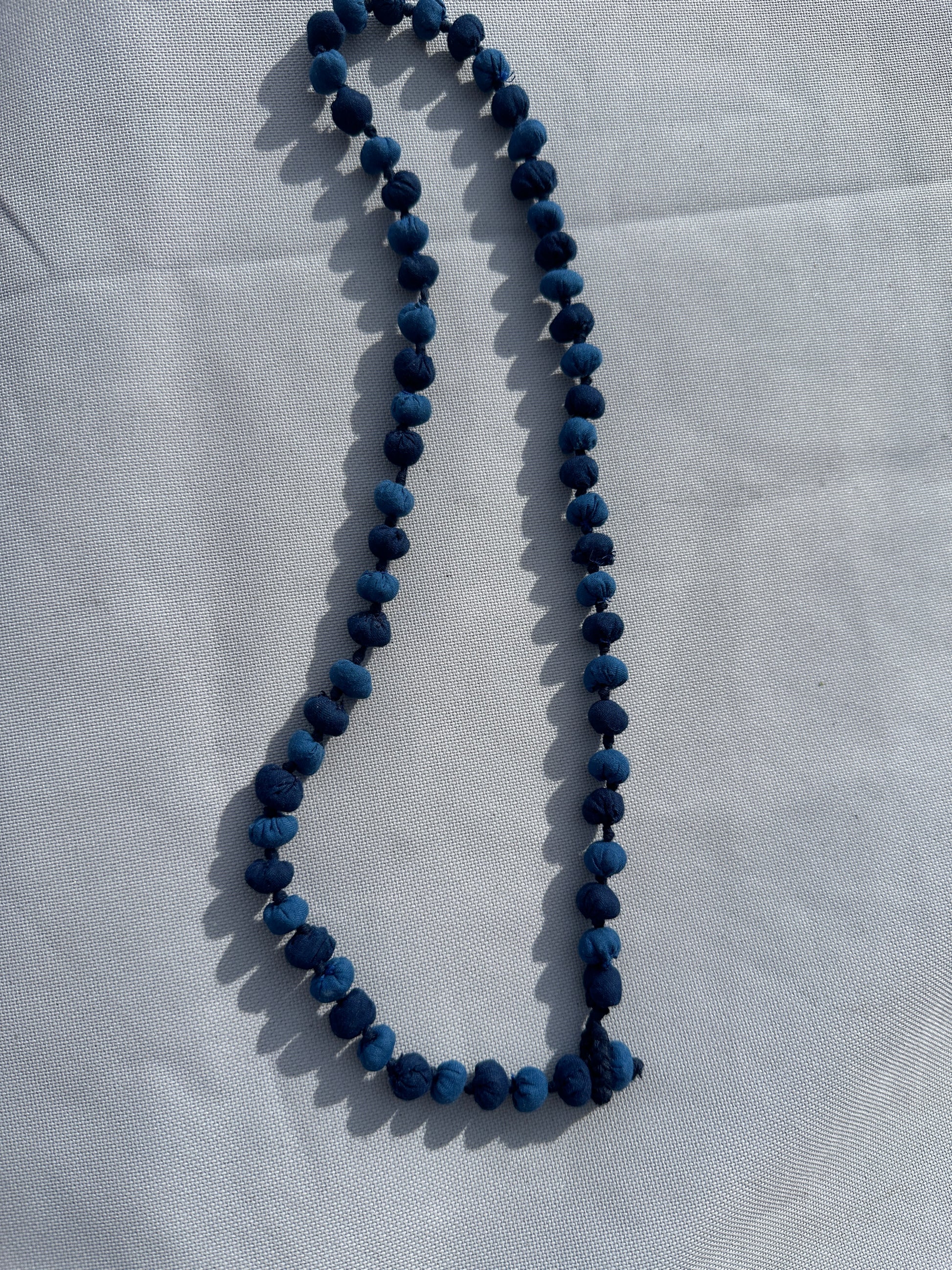 Handmade beads of Indigo Dyed scrap fabric. each bead is separated by a knot which is done with the same thread and a loop at the end to wear the necklace.