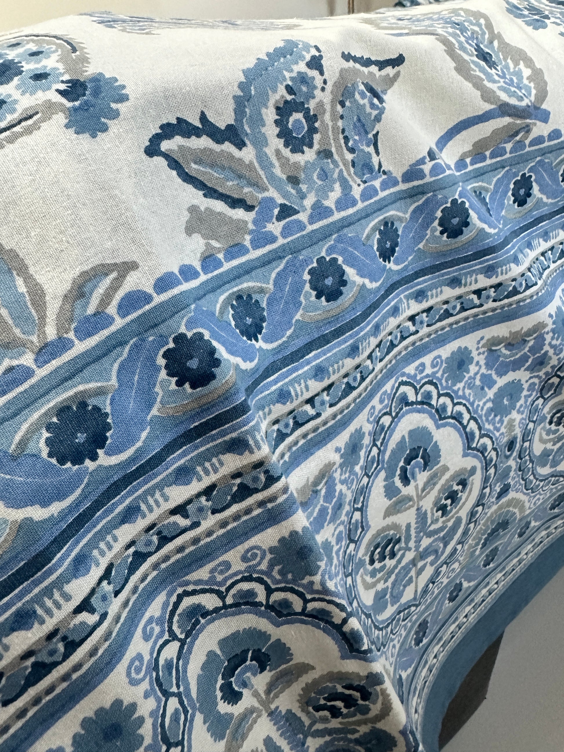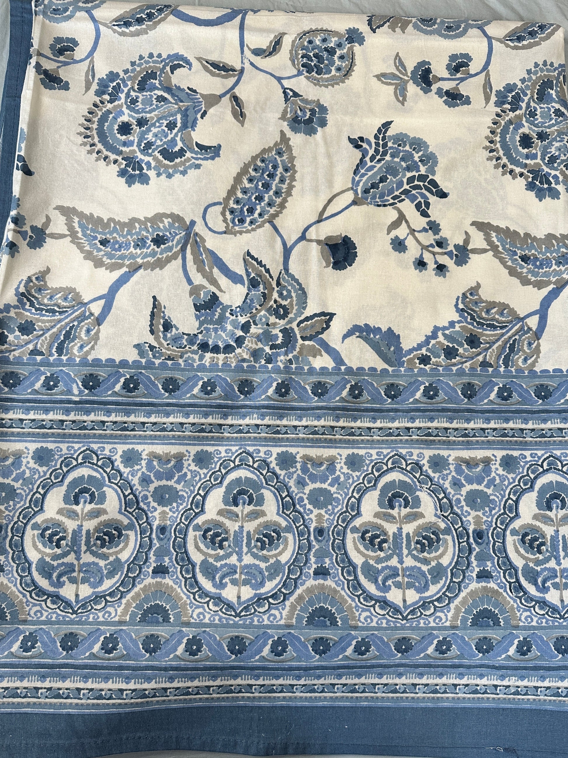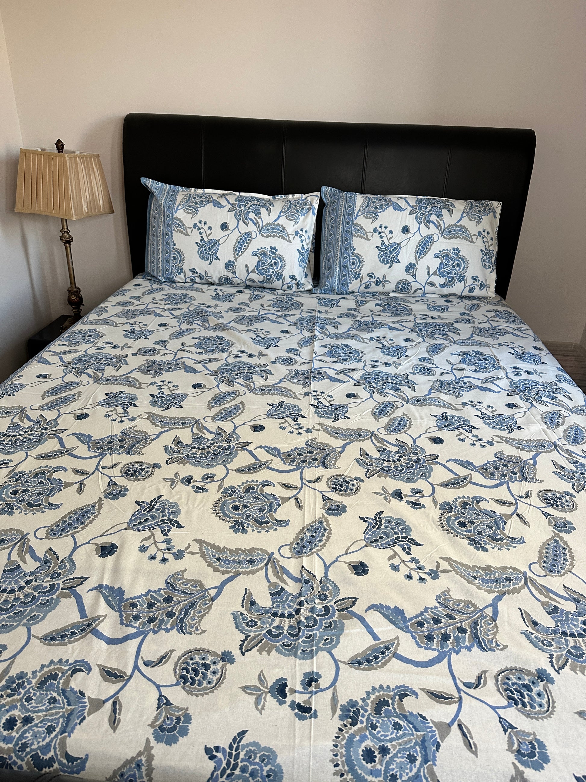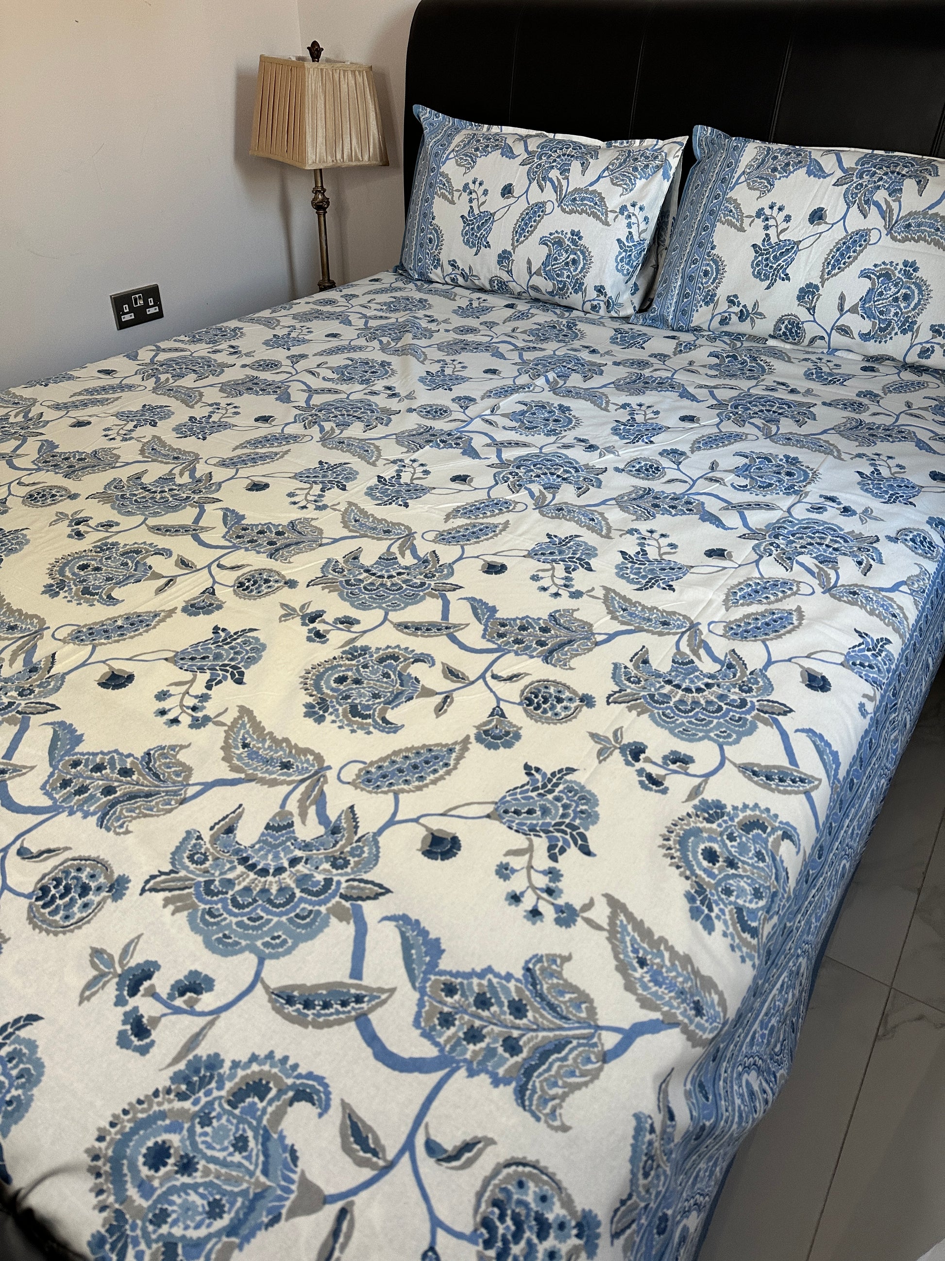 This elegant bedsheet features a serene ivory base with delicate blue floral prints inspired by traditional hand-block designs. The pattern showcases intricate foliage and blooming flowers in shades of blue and grey, creating a calming and sophisticated aesthetic. The borders feature ornate floral motifs and intricate detailing, adding a touch of luxury to the design. This lightweight and soft fabric is perfect for creating a fresh and inviting ambiance in your bedroom, combining timeless charm with modern elegance.