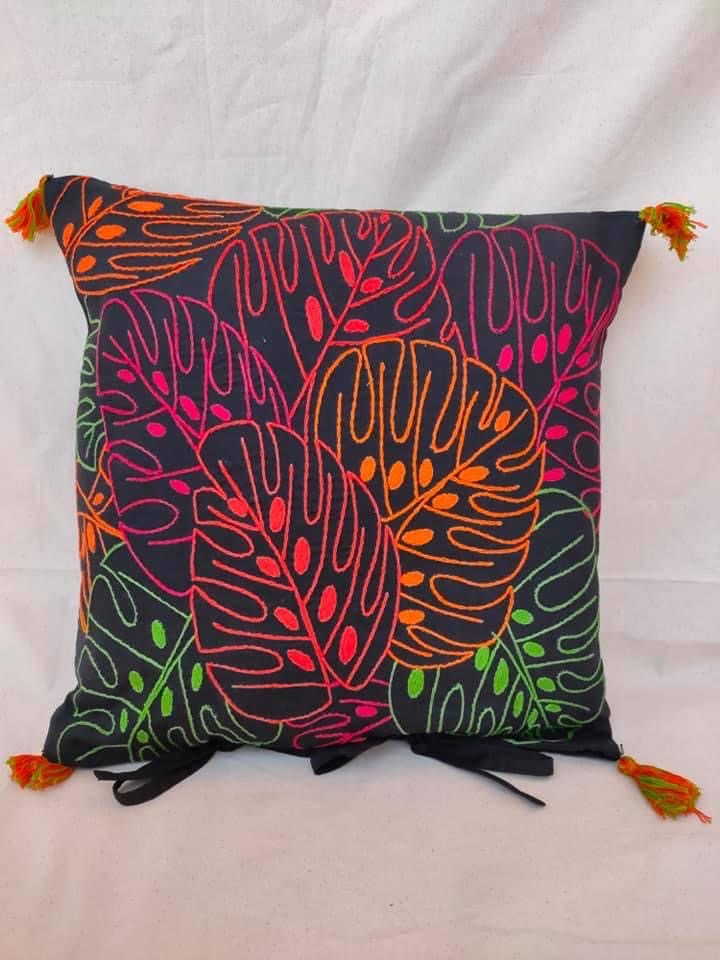 Black Monstera with Tassels - Hand Embroidered Cushion Cover