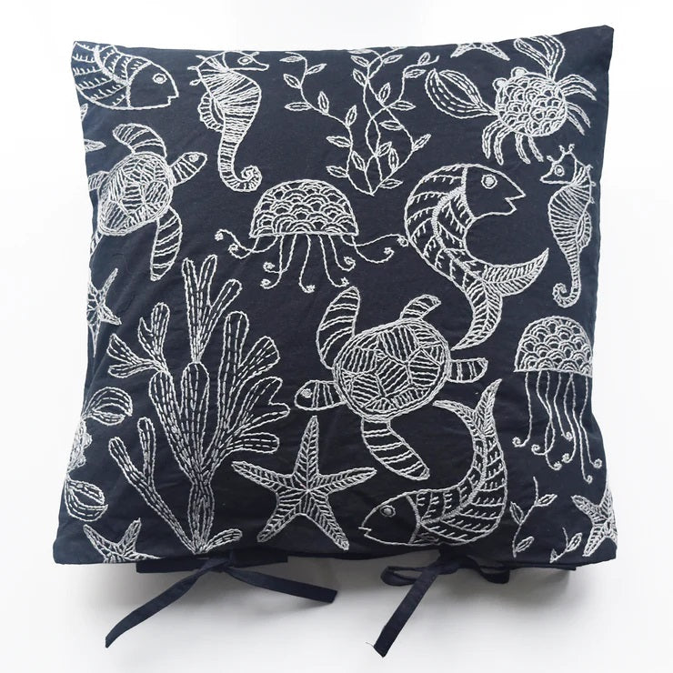 Black Sea Creatures - Hand Embroidered Cushion Cover