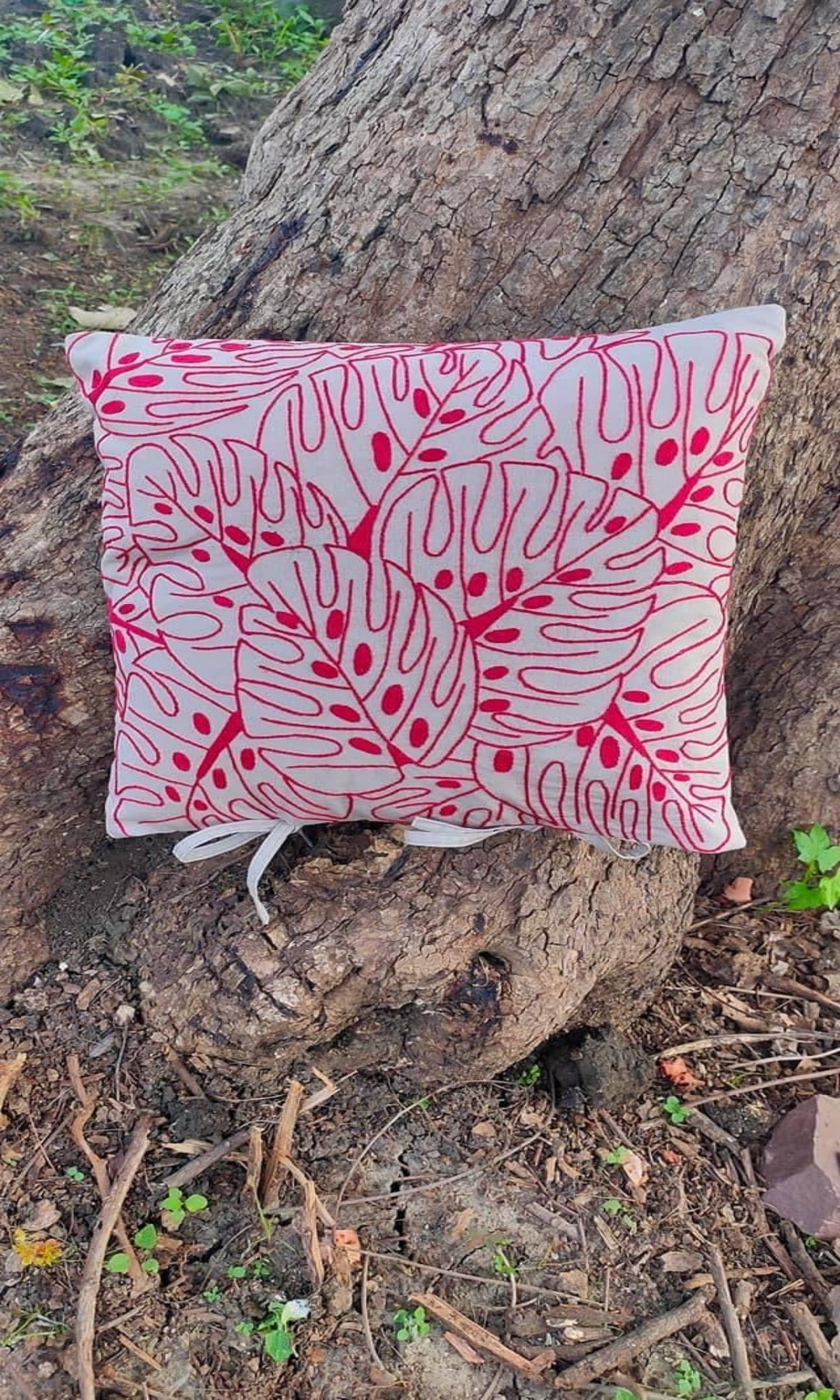 Red Monstera Plant - Hand Embroidered Cushion Cover