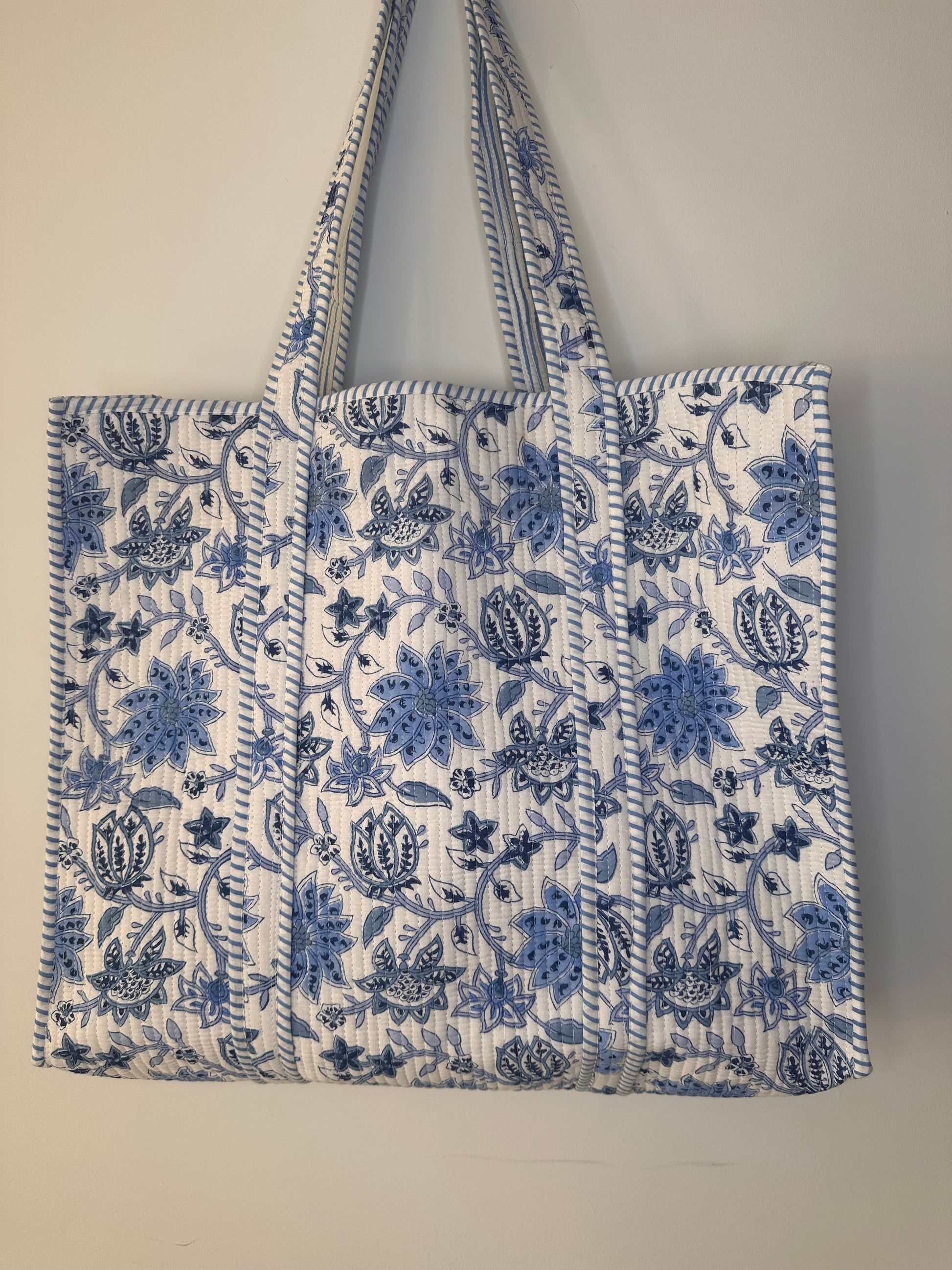 Travel sustainably in style with our one-of-a-kind handmade reversible quilted tote bags, featuring hand- block- printed serene blue florals on one side and bold blue striped pattern on the reverse. The reversible design and large size, makes this bag not only versatile but also stylish and multi-use. The pocket can feature either on the outside or inside of the bag depending on which pattern you wish to show off!