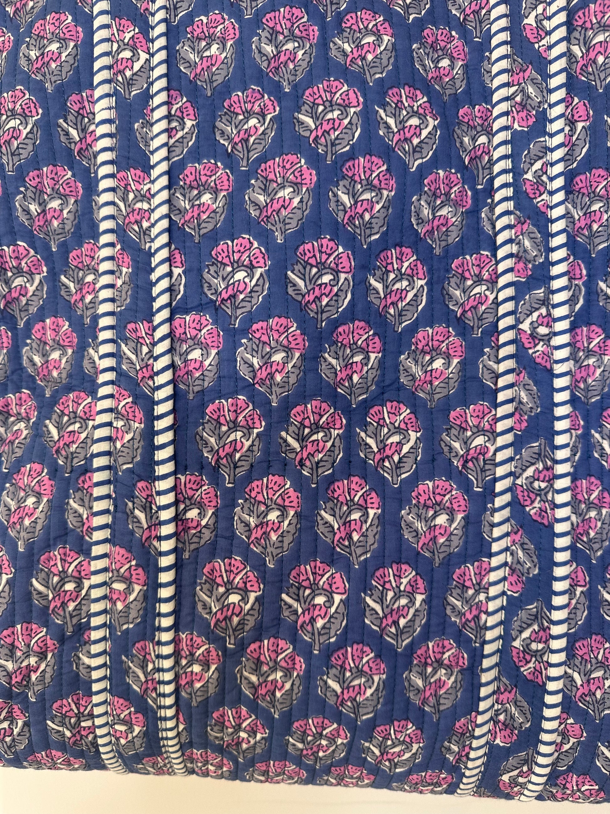 Travel sustainably in style with our one-of-a-kind handmade quilted tote bags, featuring a vibrant Indigo base adorned with hand printed floral motifs in Pink and Grey. The reversible design and large size, makes this bag not only versatile but also stylish and multi-use. The pocket can feature either on the outside or inside of the bag depending on which pattern you wish to show off!