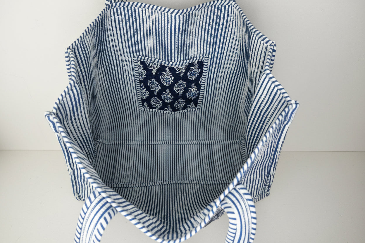 Travel sustainably in style with our one-of-a-kind handmade quilted tote bags, featuring a vibrant Indigo base adorned with hand printed white floral motifs. The reversible design and large size, makes this bag not only versatile but also stylish and multi-use. The pocket can feature either on the outside or inside of the bag depending on which pattern you wish to show off!