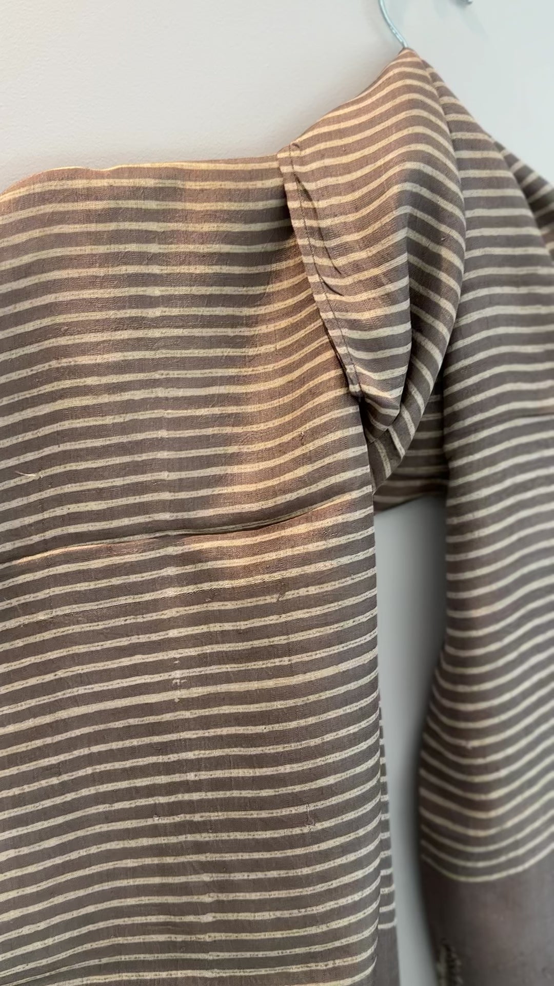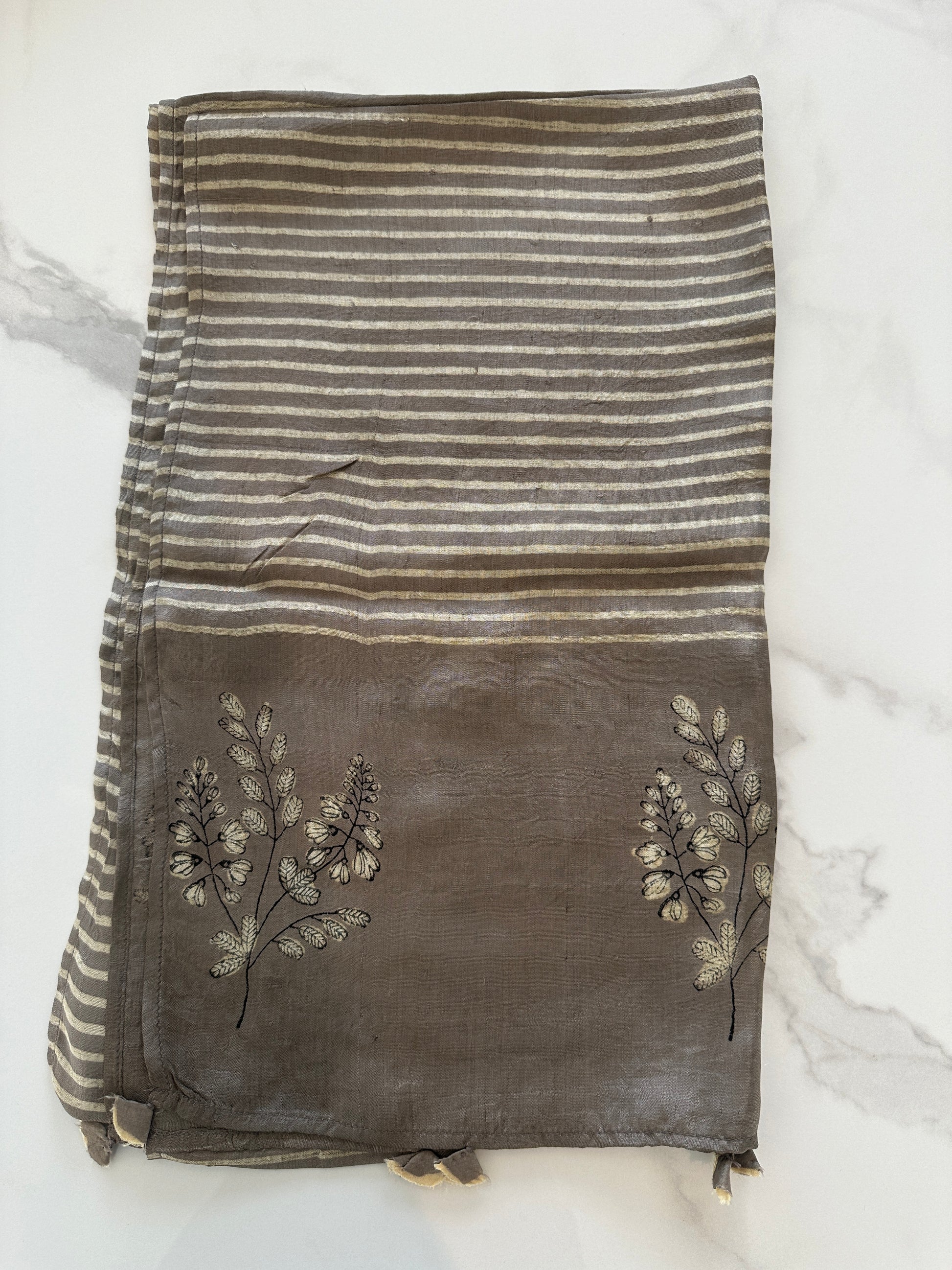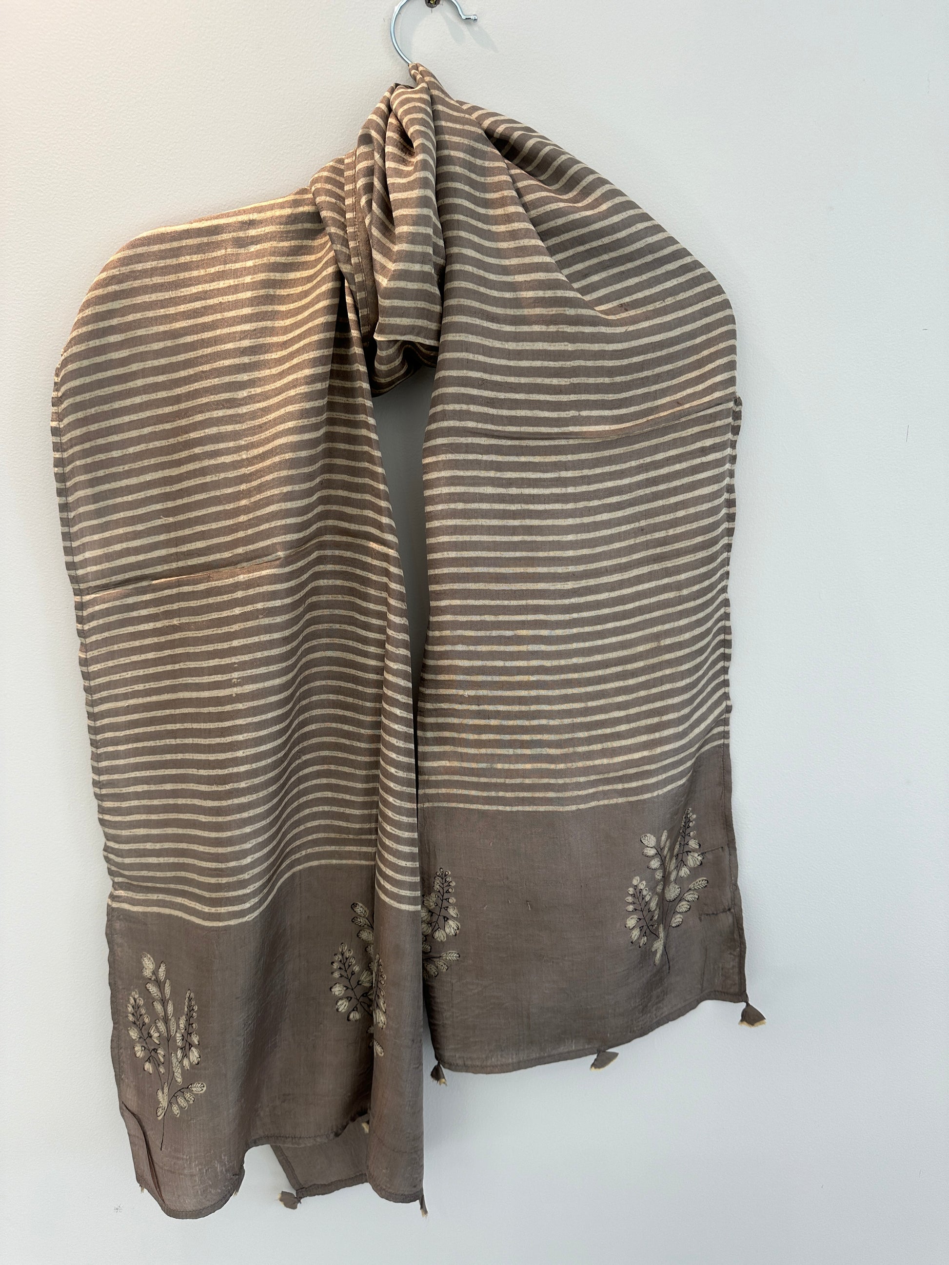 The stole features a tasteful play of stripes across the body, adding a contemporary flair to the classic design. Intricately hand block printed, a bush pattern graces the border, creating a delightful contrast to the structured stripes. The carefully curated combination of stripes and botanical motifs creates a visual symphony, capturing the essence of nature's beauty.