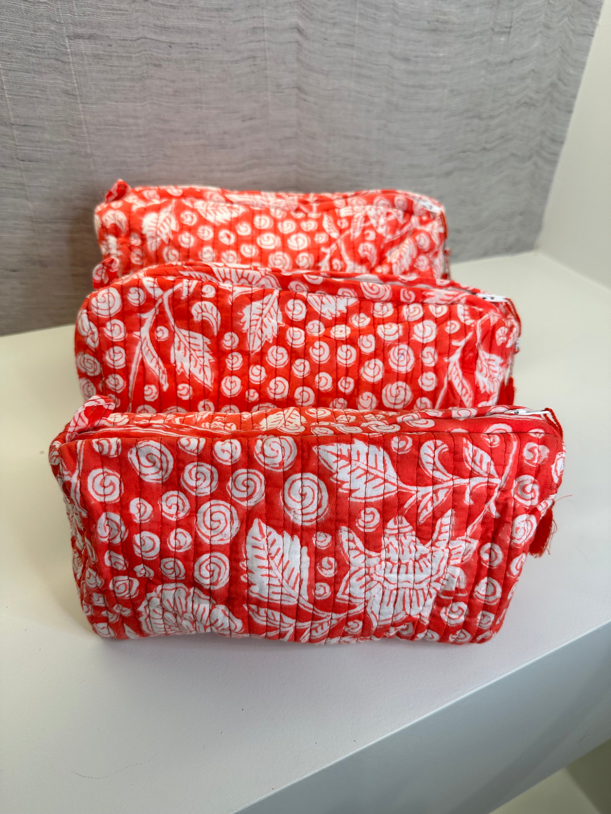 Bright hand-block printed pouches come as a vibrant collection of three with a unique and beautiful flowers print on orange background to add a touch of charm to your everyday storage needs.