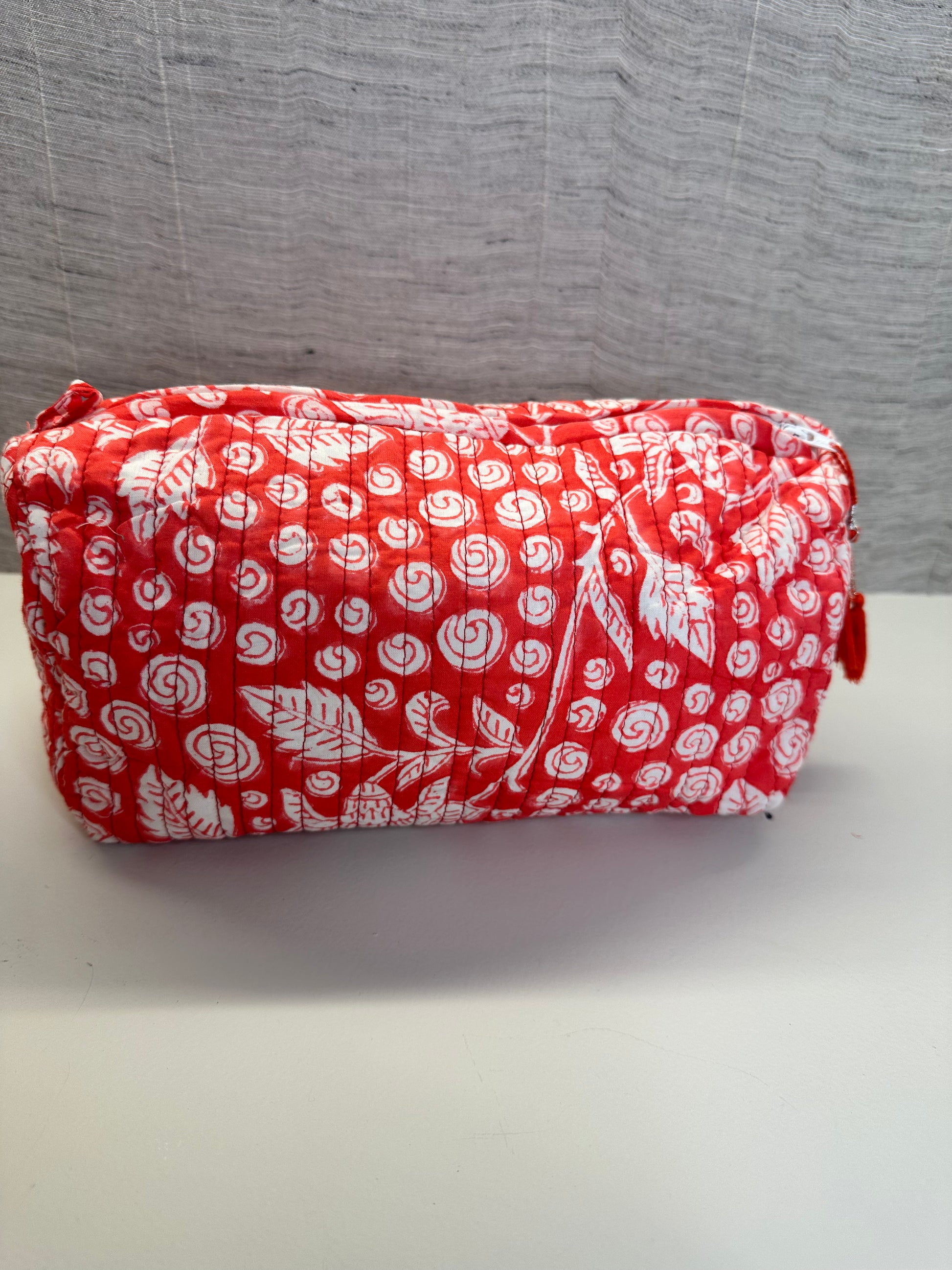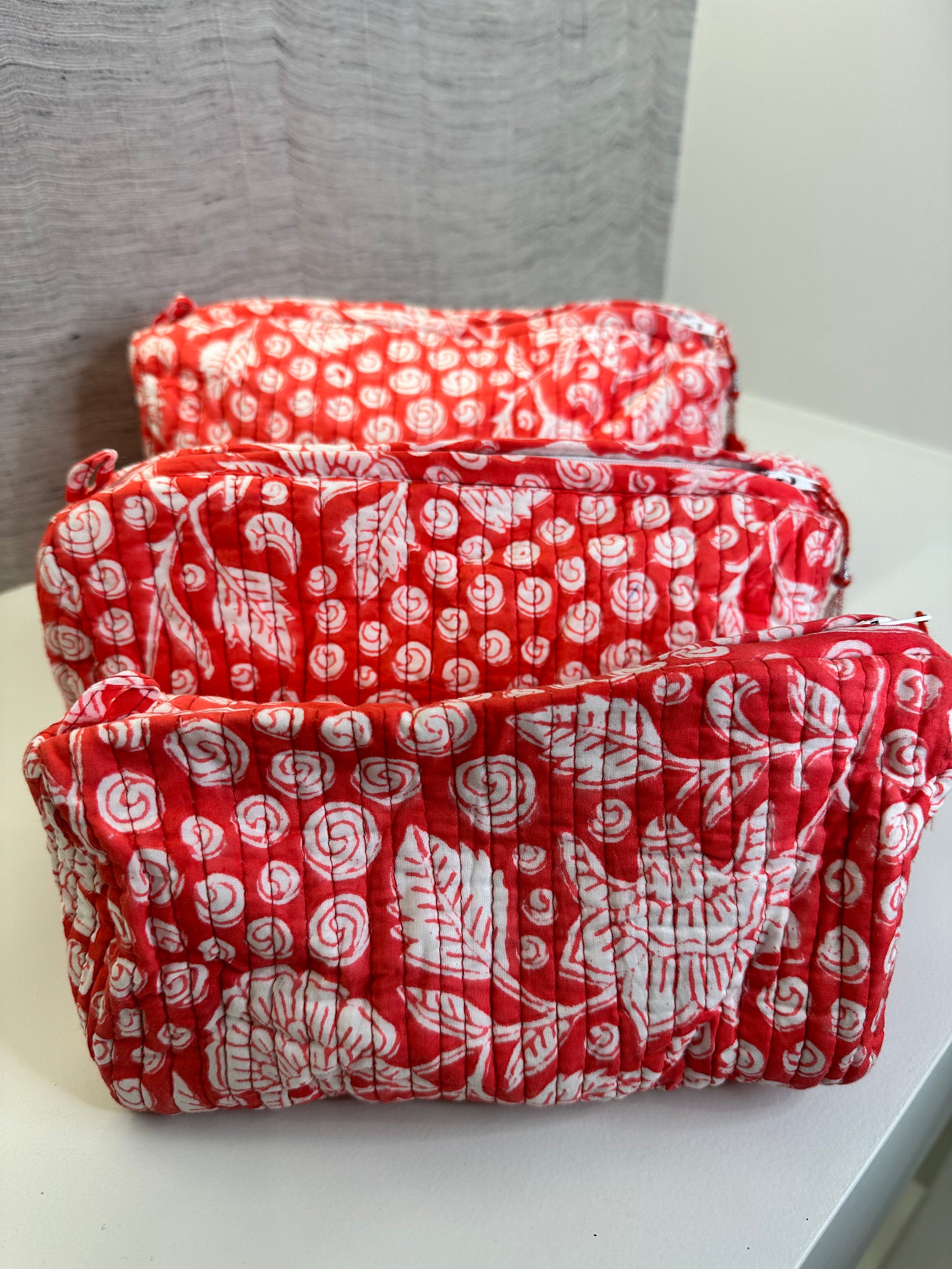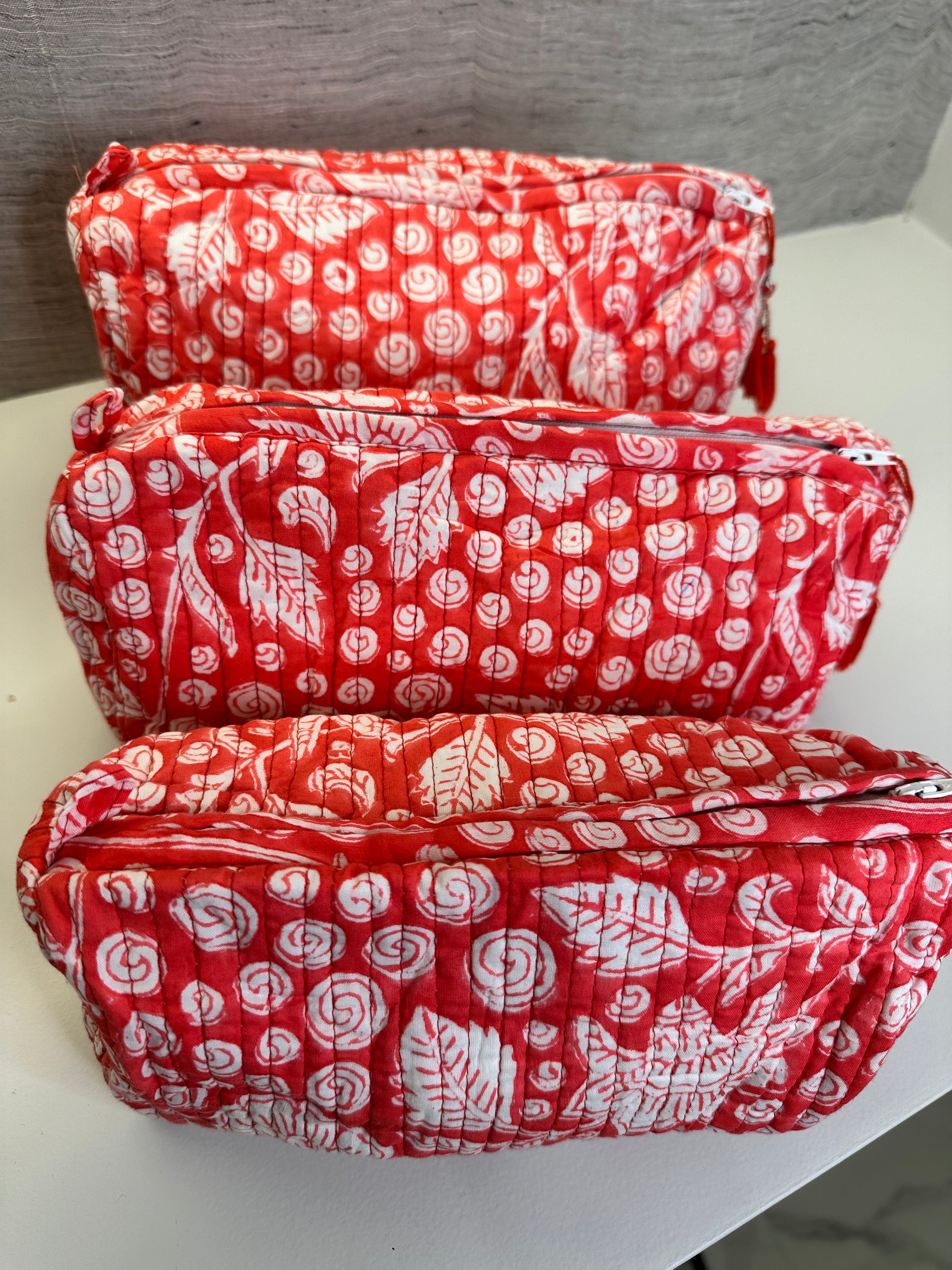 For maintenance, these pouches are machine washable in cold water using a mild detergent. Please note that bleach, scrubbing, tumble drying, and prolonged soaking should be avoided to preserve their vibrant prints and quality craftsmanship.