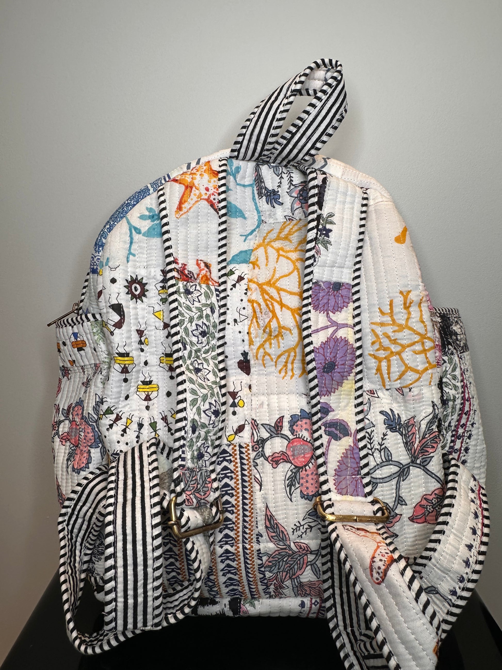 Prefer backpacks over shoulder bags? Travel sustainably in style with our one-of-a-kind handmade quilted backpacks, carefully crafted using unique patchwork designs that reuse cotton fabric scraps where possible, reducing waste. These backpacks feature a front, side and inside pockets, making this bag not only stylish but also versatile.