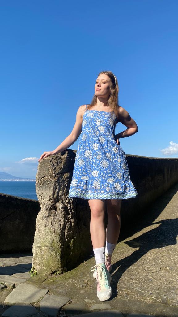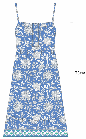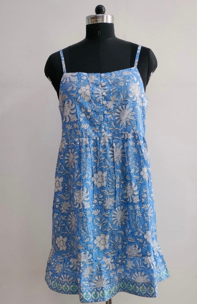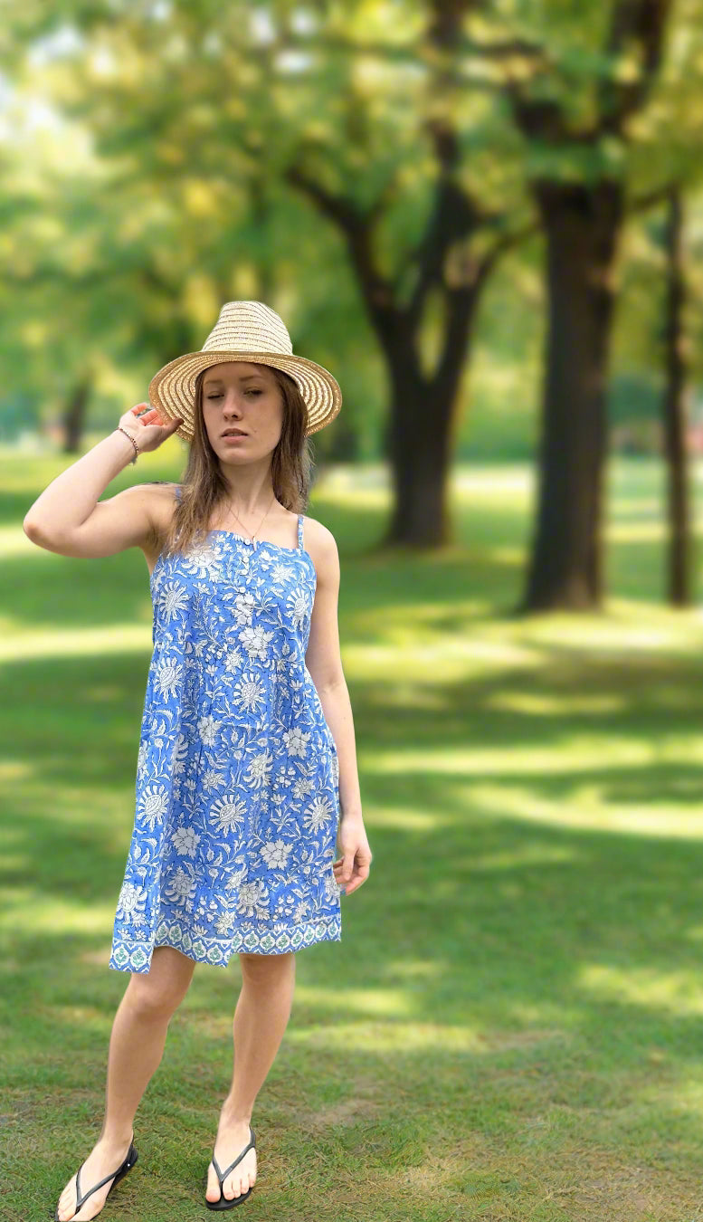 Our limited edition "Neer" Summer Dress is a stylish, eco-friendly piece featuring a blue base with white flowers, hand block printed using plant-based dyes. With adjustable straps and breathable fabric, it's perfect for summer outings. Each dress is uniquely crafted by artisans, making it a one-of-a-kind statement piece.