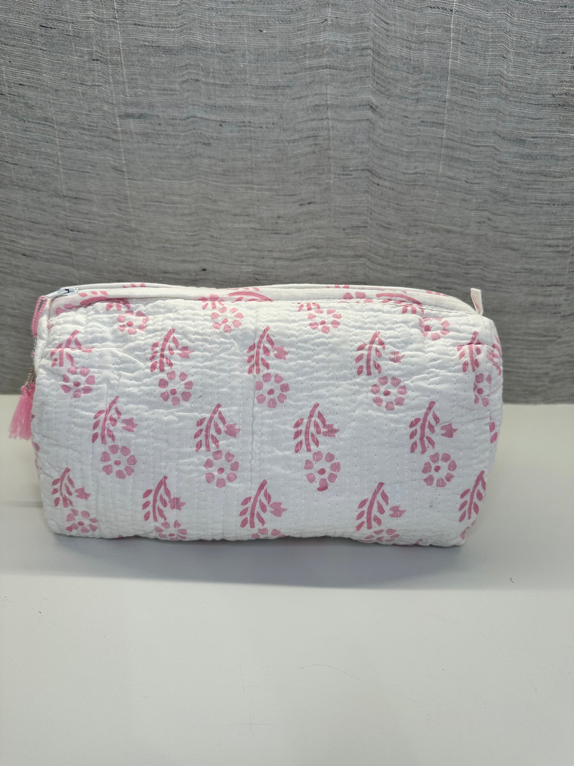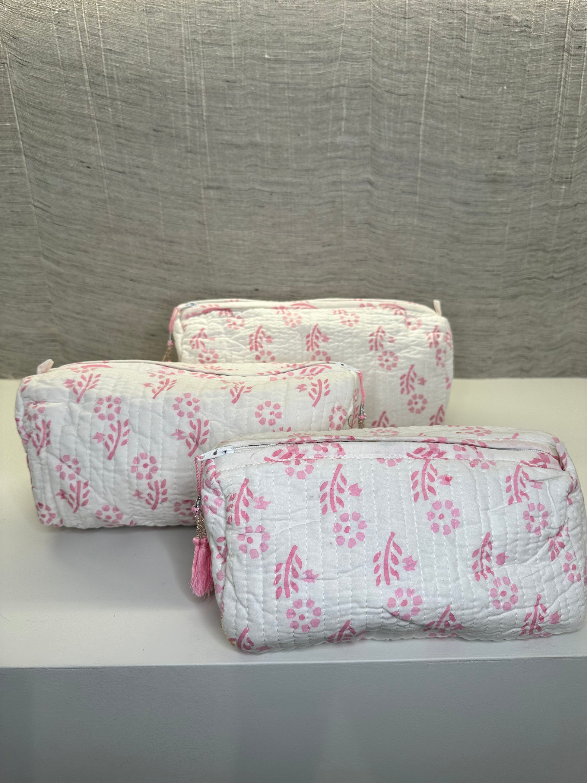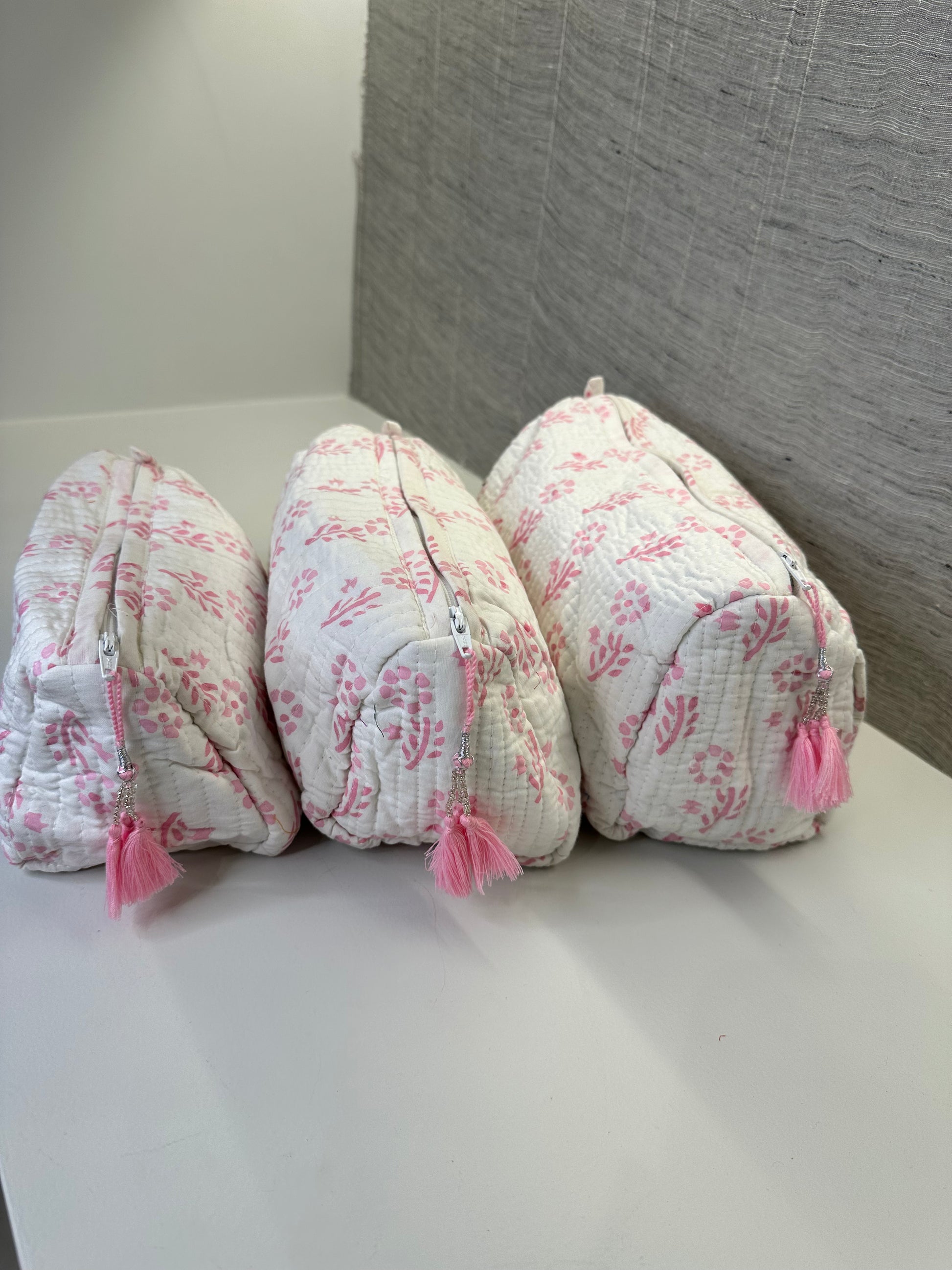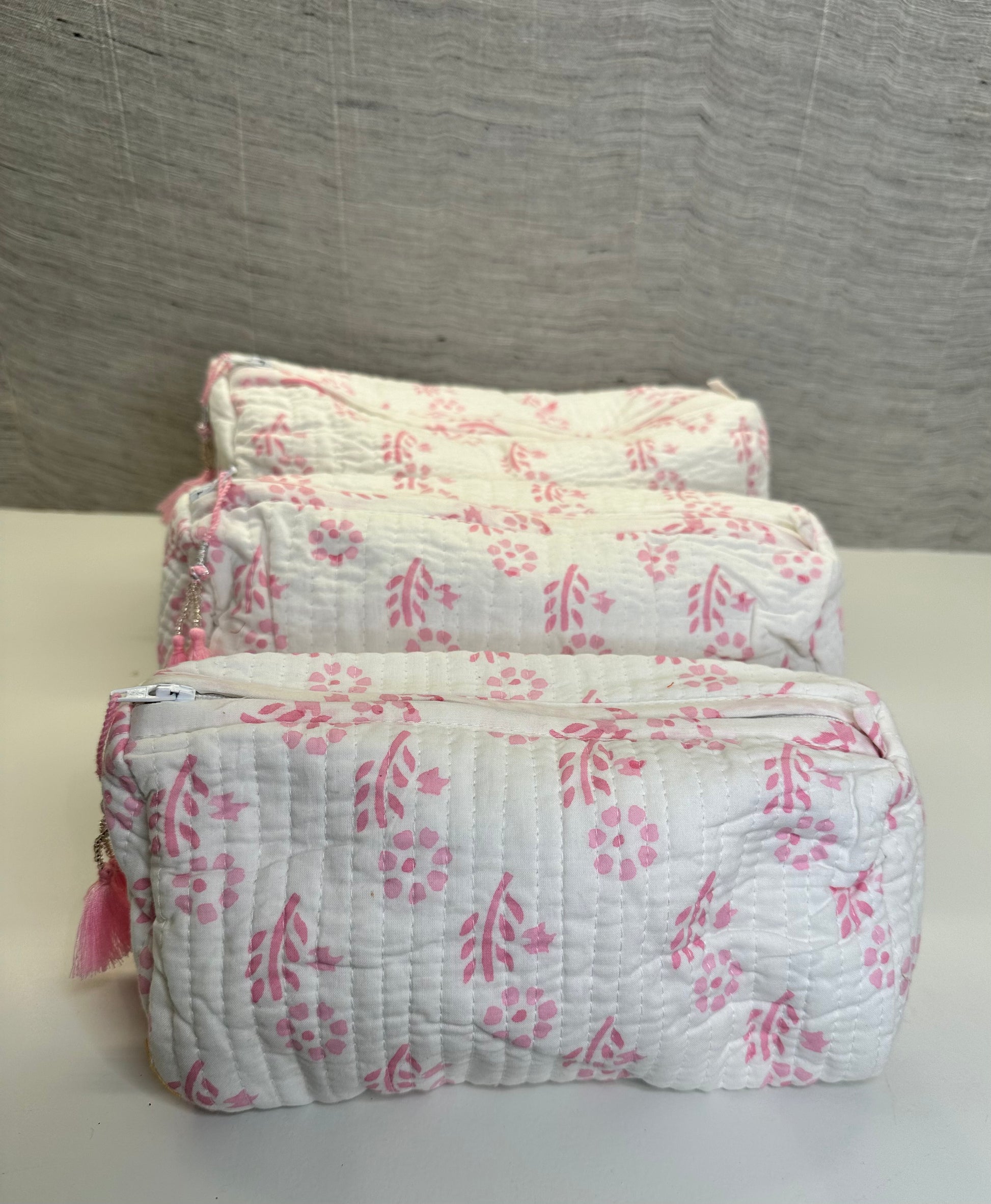 Bright hand-block printed pouches come as a vibrant collection of three with a unique and beautiful pink floral print on white background to add a touch of charm to your everyday storage needs.