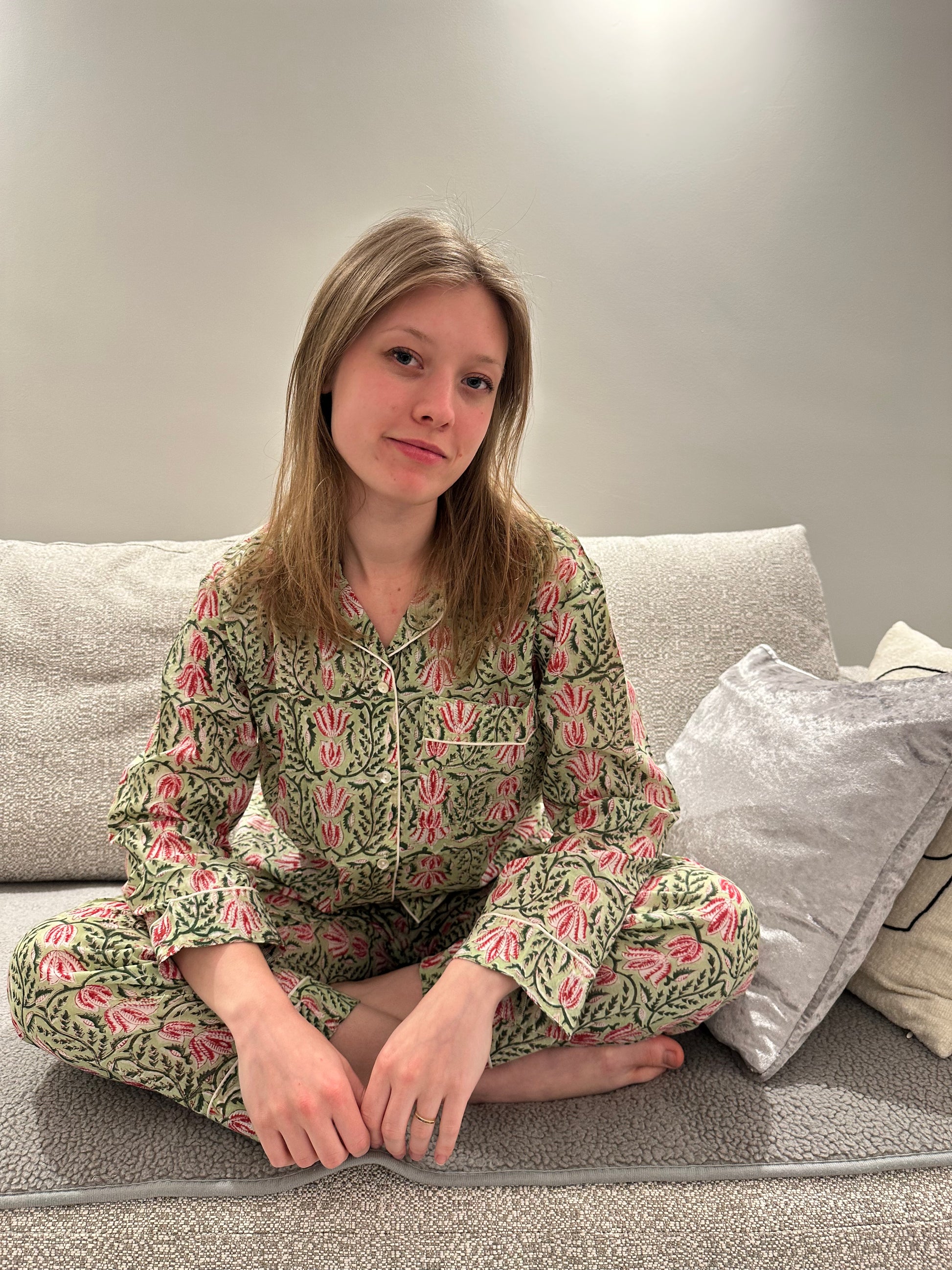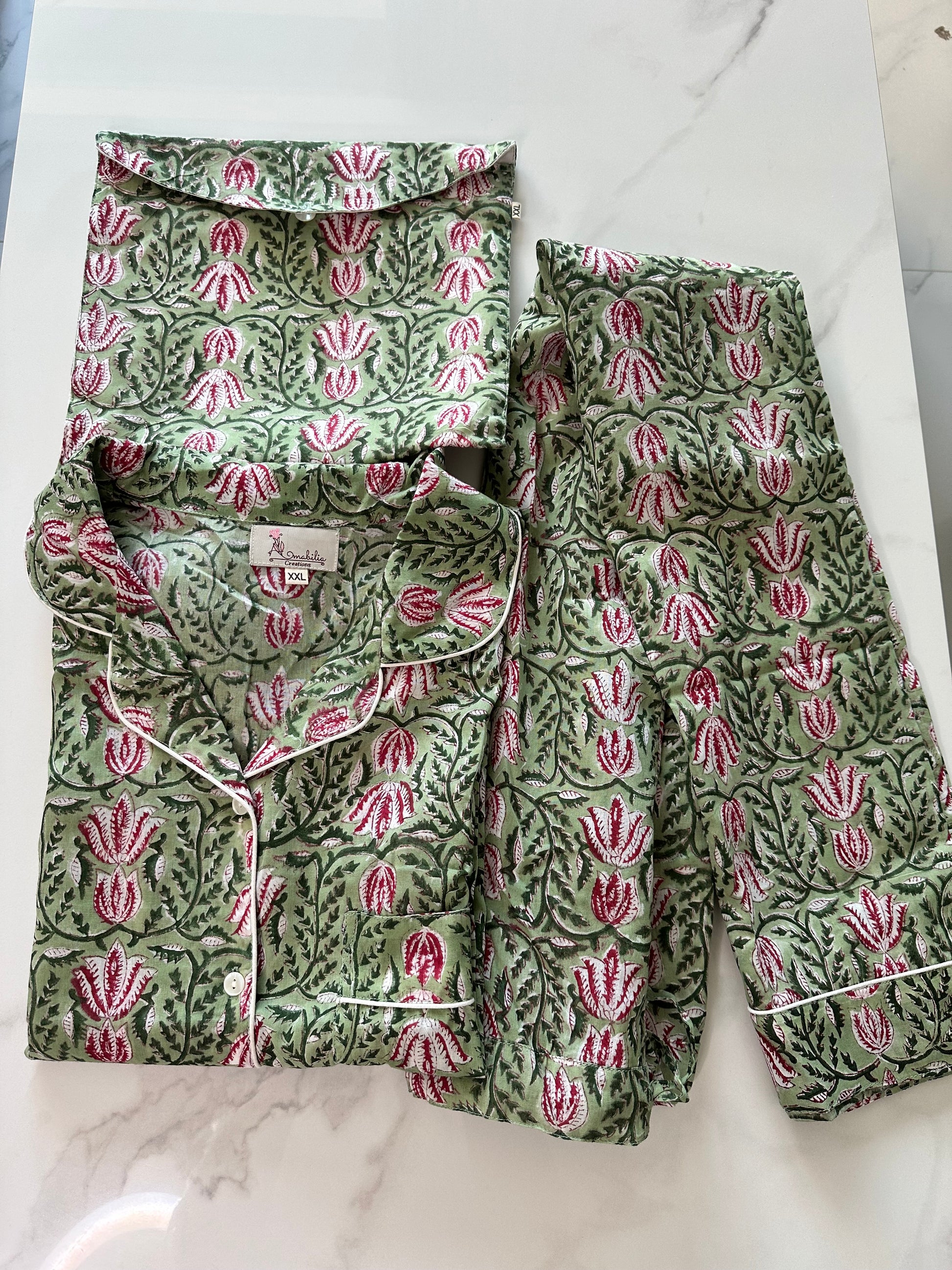 Wrap yourself in comfort with our Tulip Twilight PJ Set, crafted from 100% breathable block-printed cotton perfect for year-round lounging. Featuring a delicate floral motif in soft olive and rose tones, this set brings artisanal charm to your nightwear. Designed for relaxed evenings and slow mornings, with a classic button-down top and drawstring trousers for an effortless fit. Ethically made, naturally stylish.