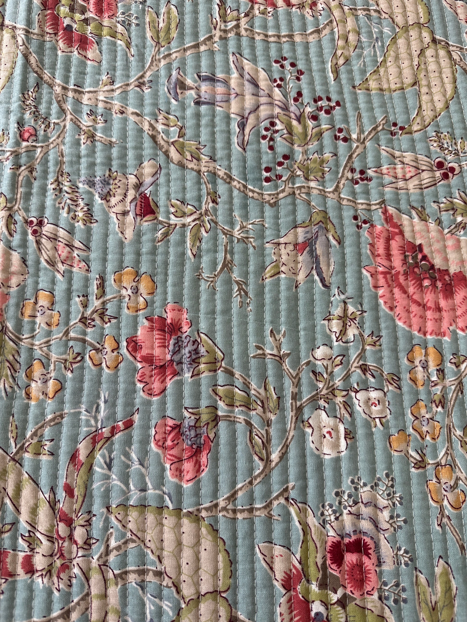 Beautiful, reversible, hand block printed, soft touch quilted bedcover. These can also be used as a throw. Two matching pillowcases included.