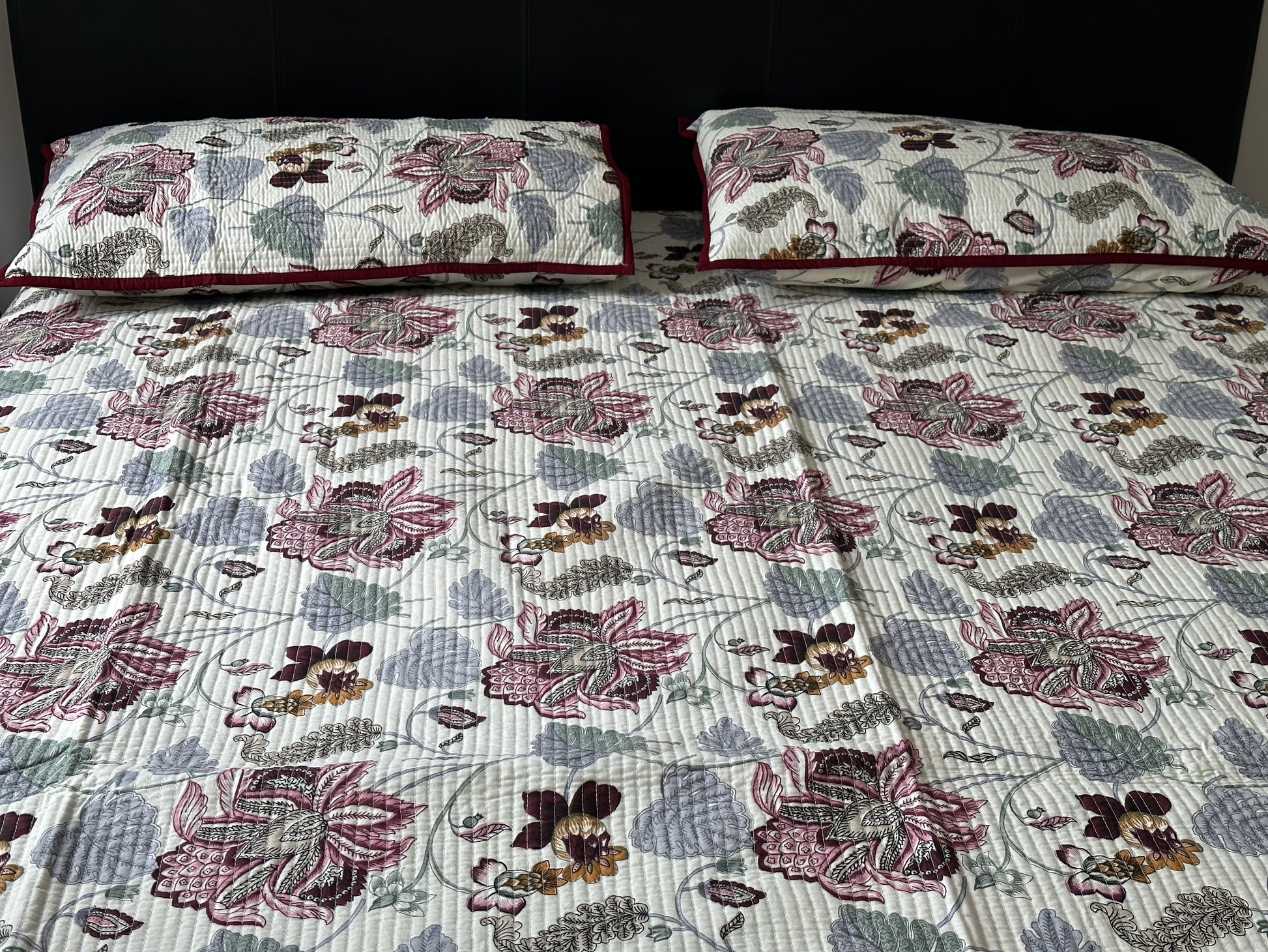Beautiful, reversible hand block printed, soft touch quilted bedcover. These can also be used as a throw. Two matching pillow cases included.