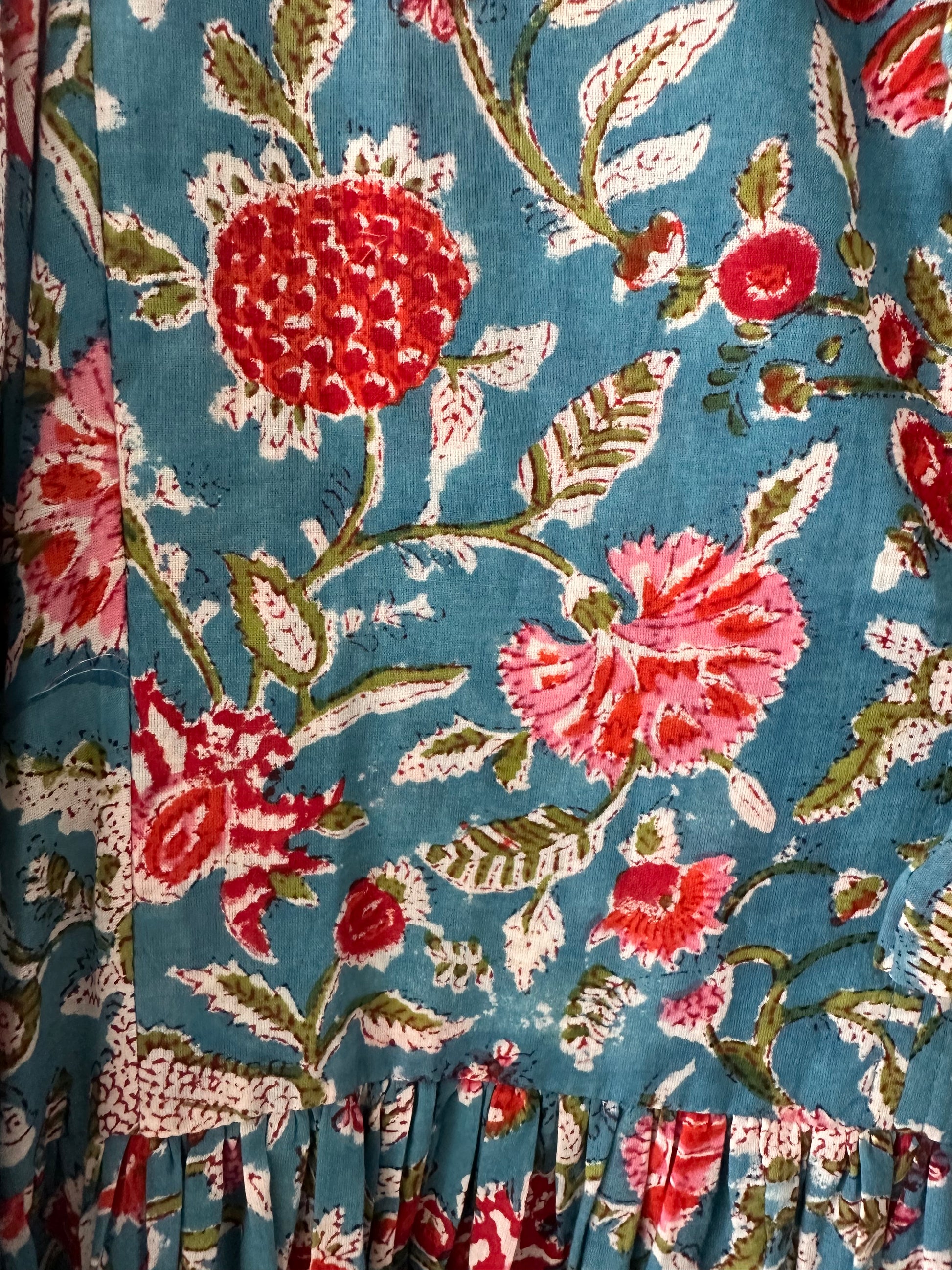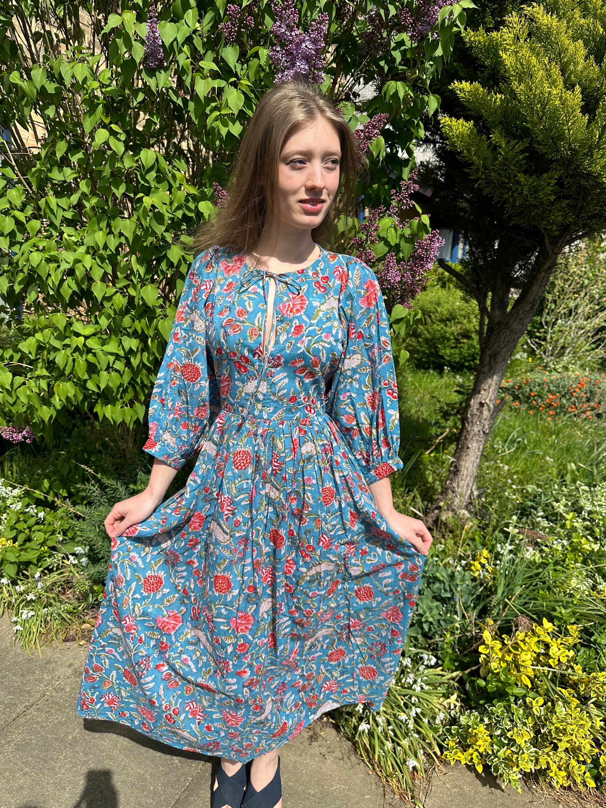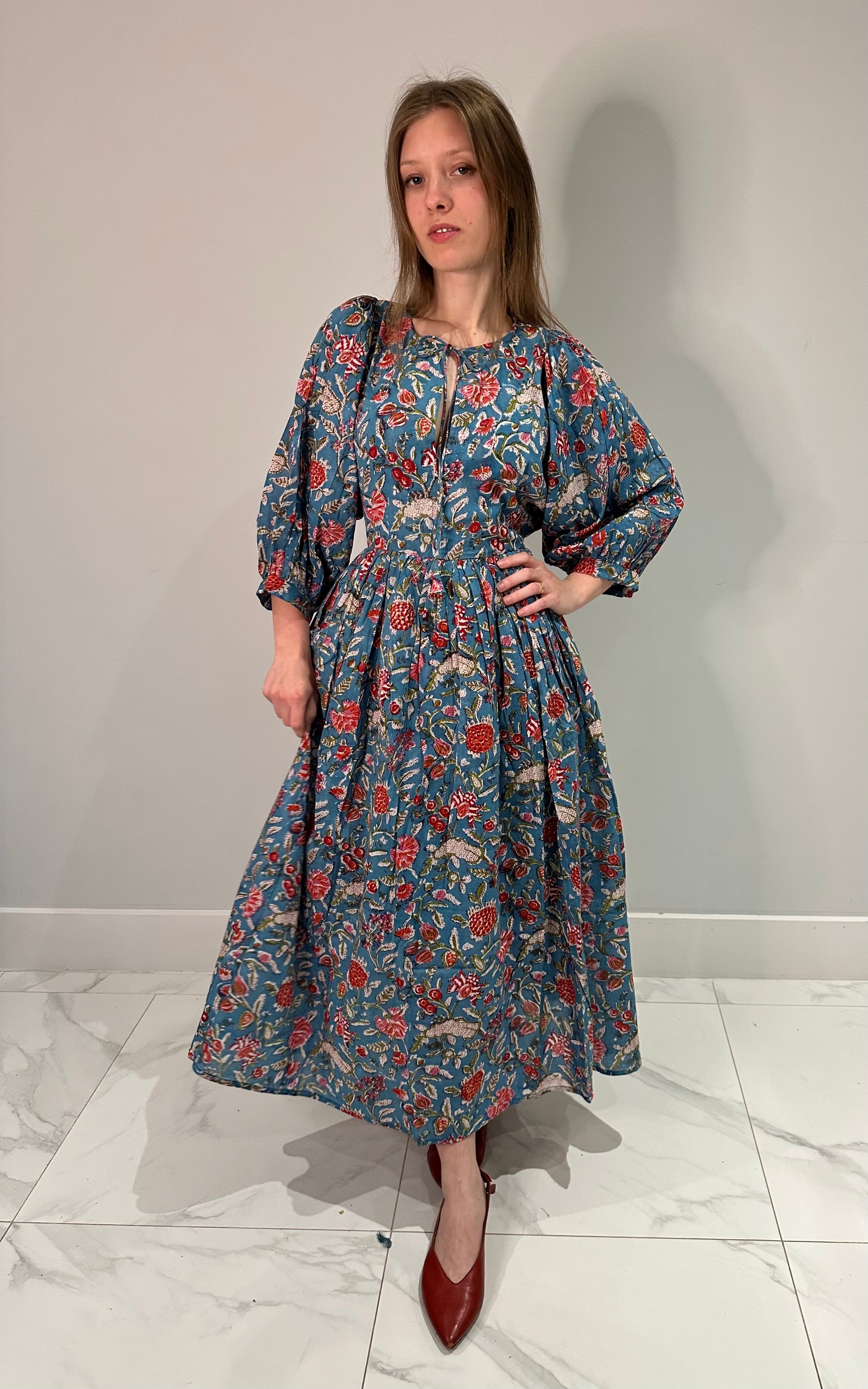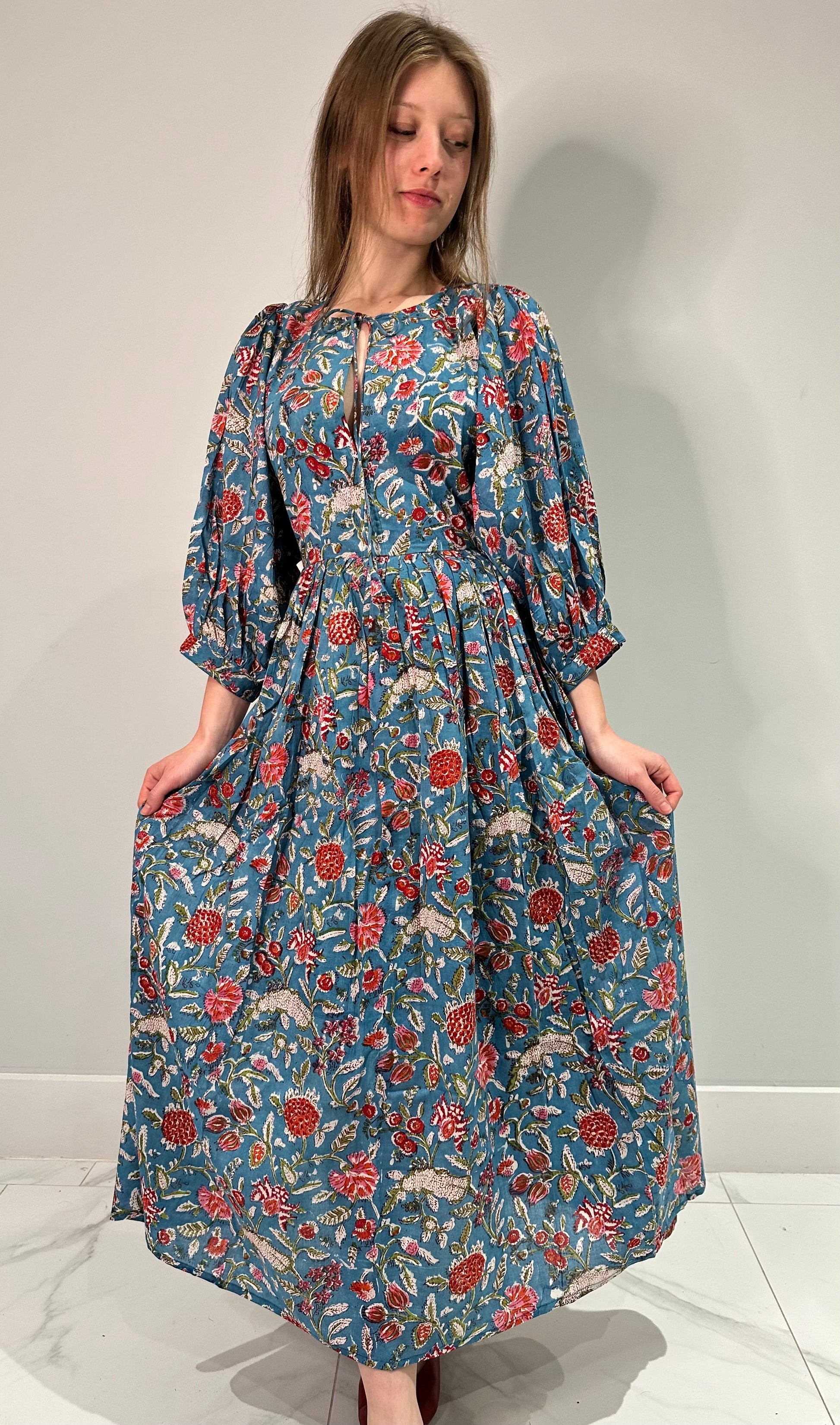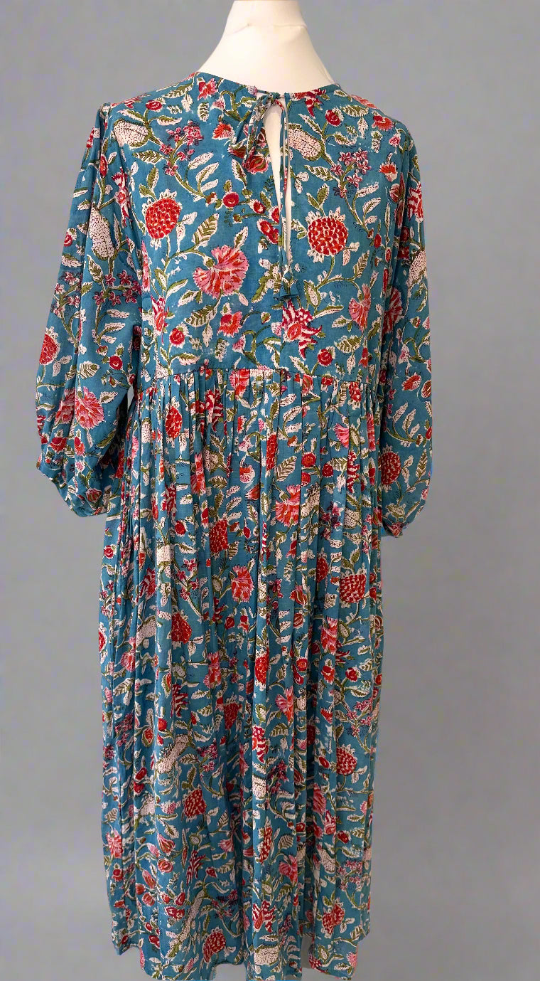 Teal Bloom is a celebration of colour and craft. This flowing midi dress features a rich teal base adorned with intricate hand block-printed florals in shades of crimson, ivory, and leaf green. Designed for effortless elegance, it has soft gathers at the waist, voluminous sleeves, and a delicate tie-up neckline.