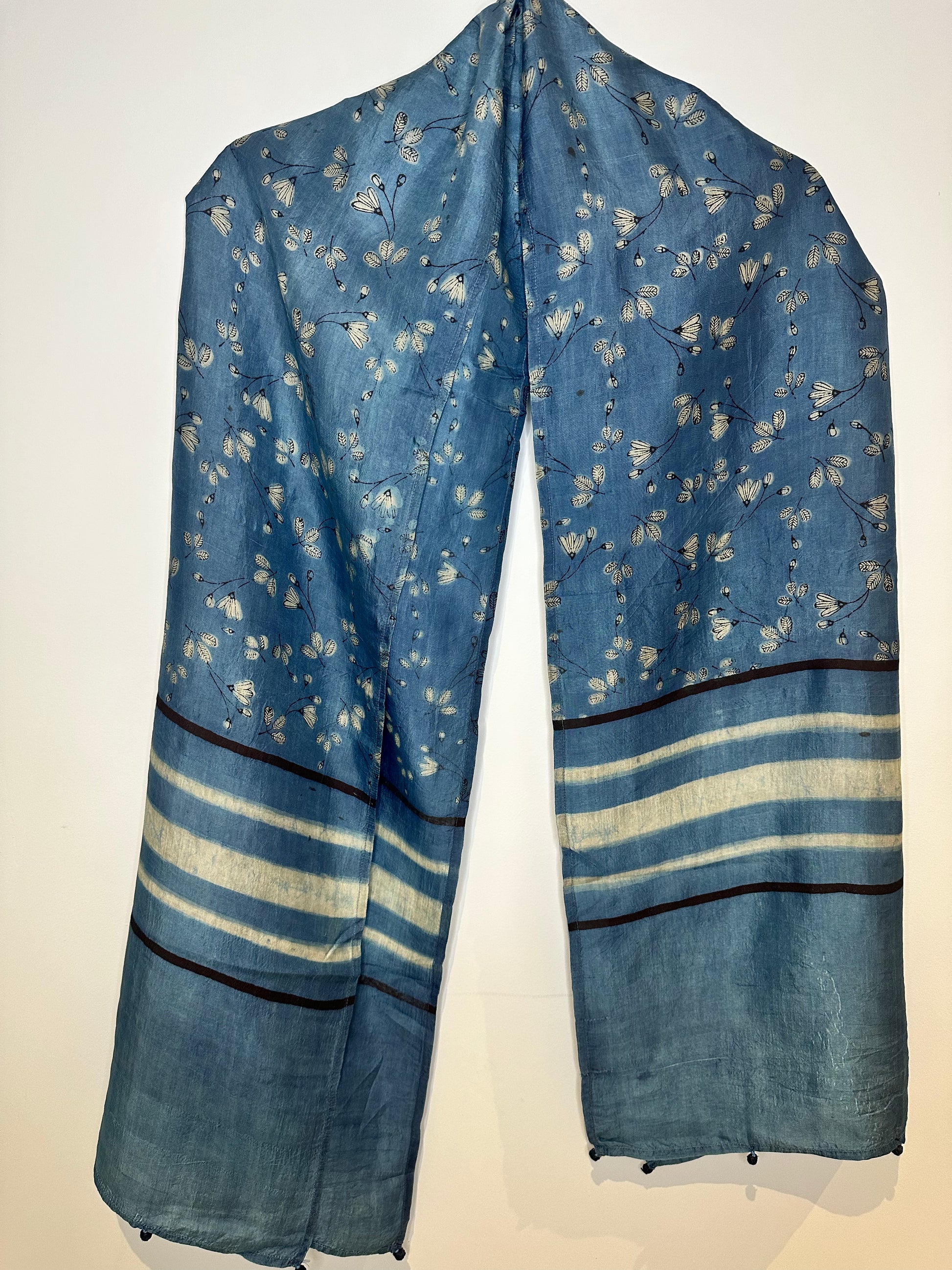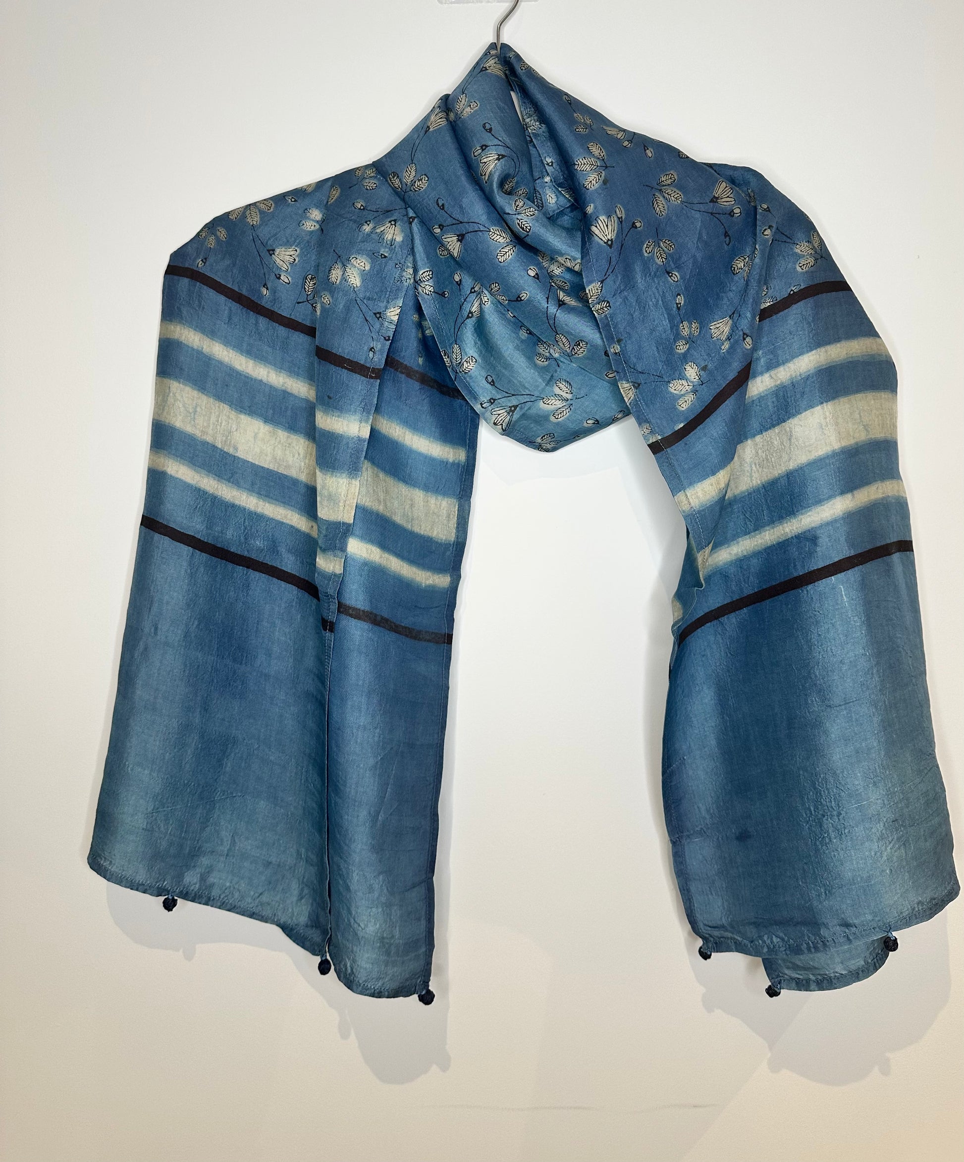 Elevate your style with this opulent mulberry silk scarf adorned with a hand block printed floral pattern. The light and dark indigo tones and intricate design create a sense of luxury, perfect for adding a touch of refinement to any outfit
