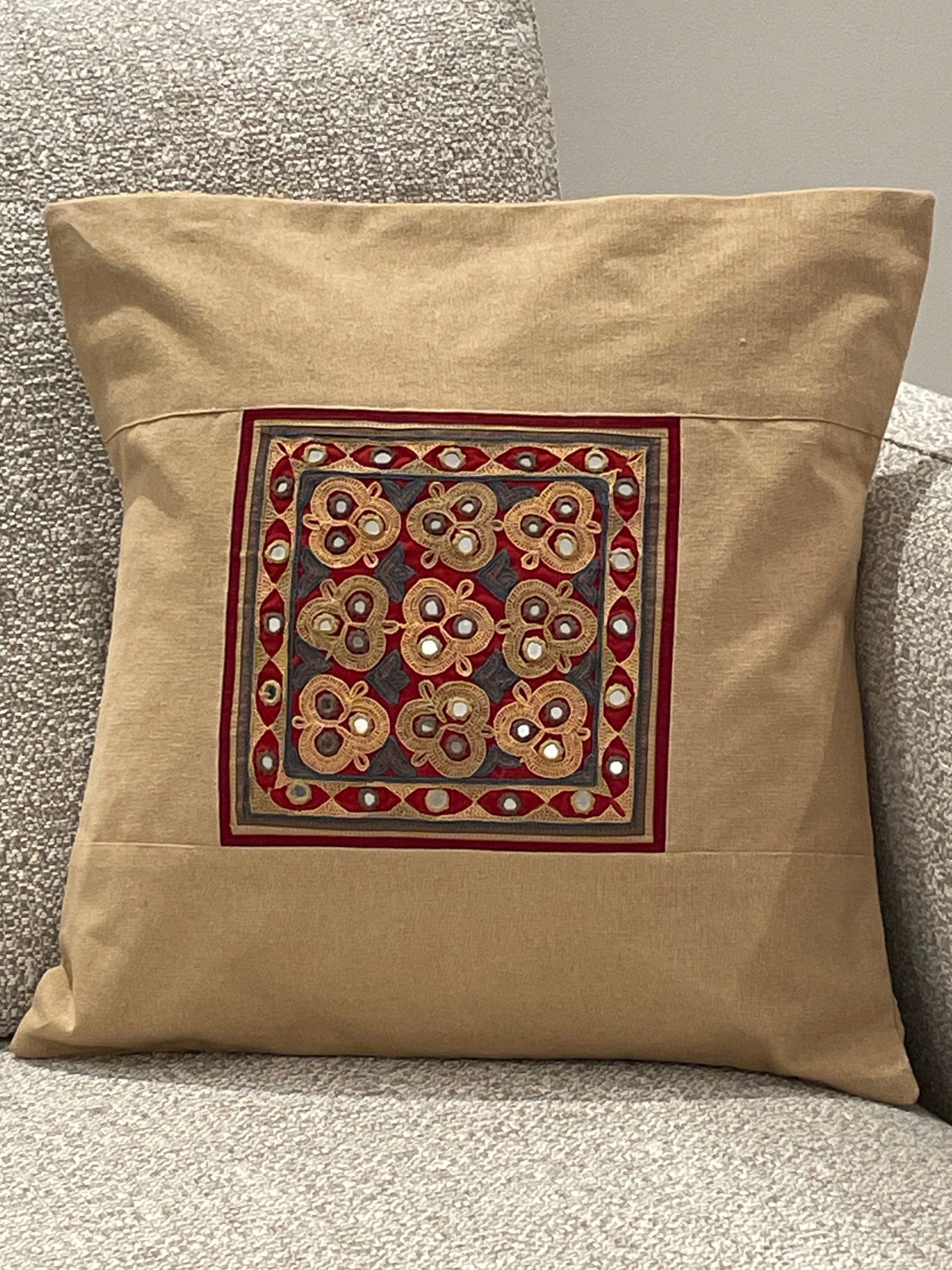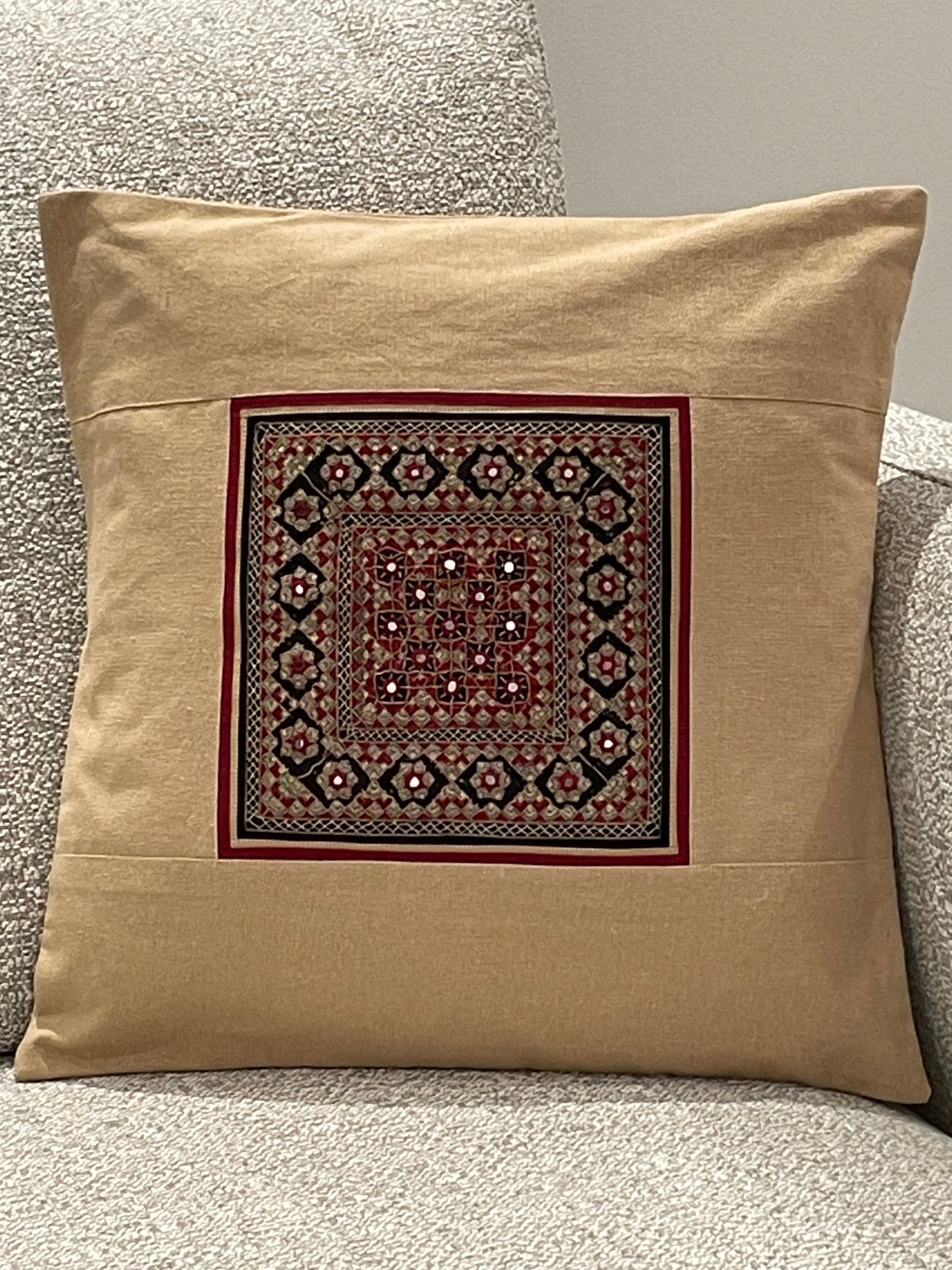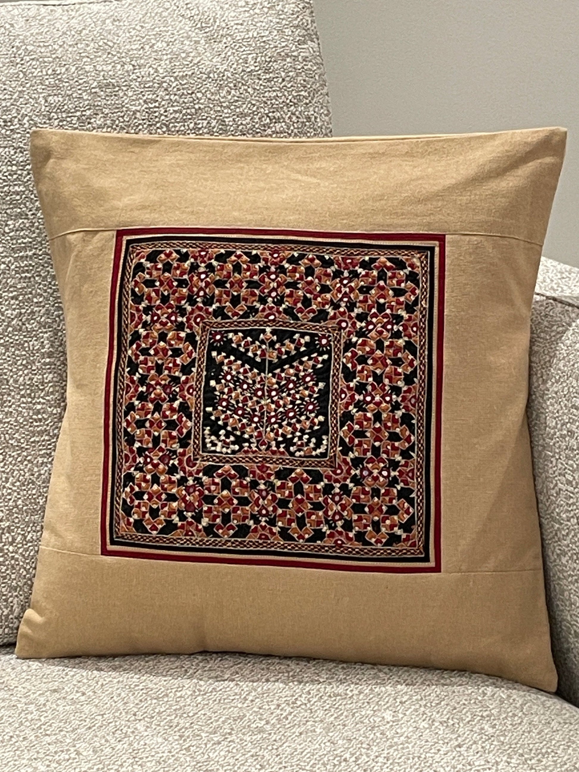 These cushions are adorned with intricate mirror work, with each embroidery style adding its own unique character. Kutch Neran embroidery is celebrated for its bold, geometric patterns and precise stitch work, often incorporating symbolic motifs that reflect the cultural heritage of the Sodha Rajput community. In contrast, Ahir embroidery is distinguished by its flowing, curvilinear designs and the extensive use of vibrant colors, creating a lively, floral-inspired aesthetic that is characteristic of the Ahir community. Jat embroidery, known for its detailed and densely packed patterns, features vibrant hues and intricate stitches, often forming complex, symmetrical designs that echo the rich cultural history of the Jat community.