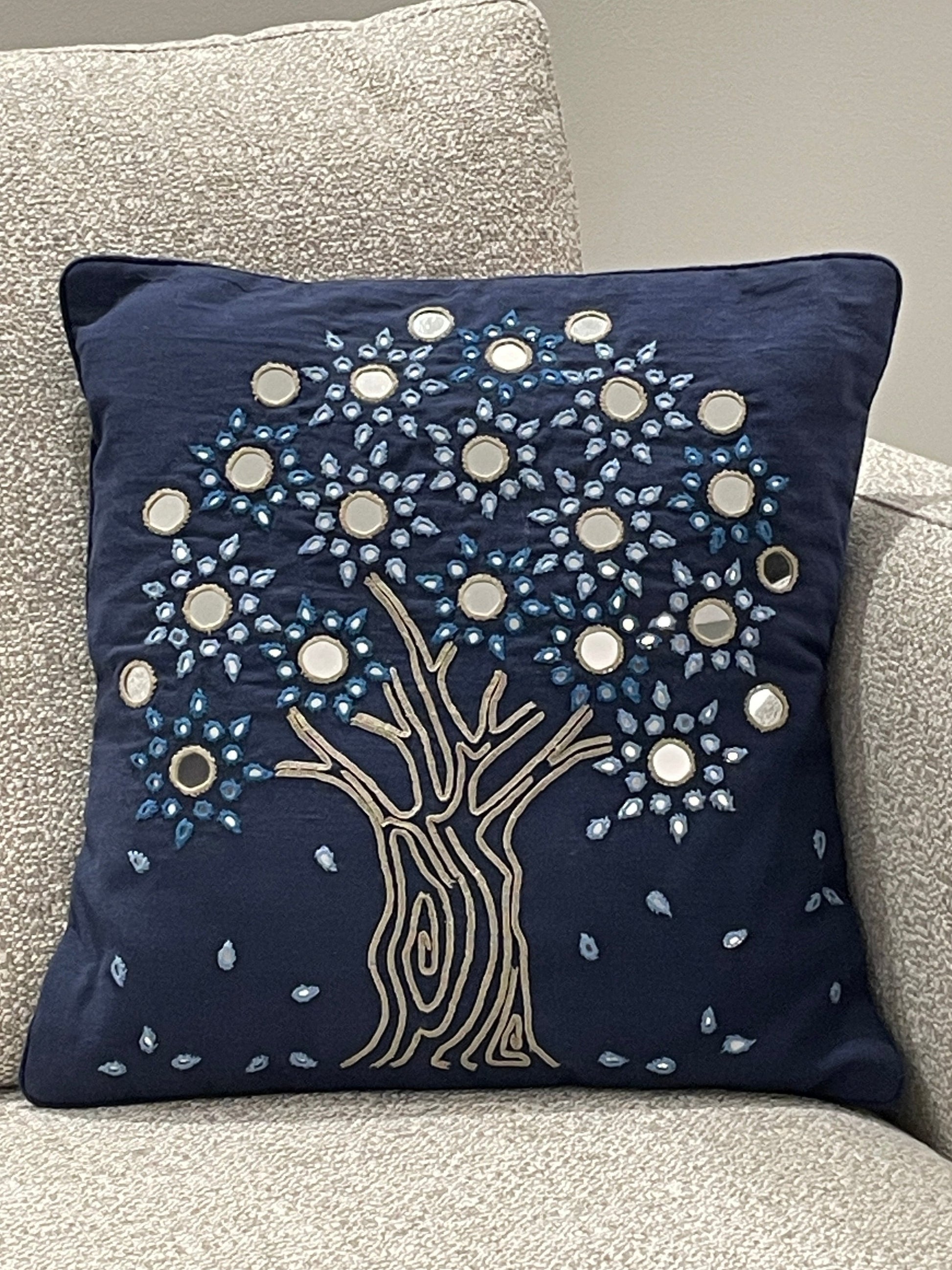 Add cultural elegance to your home with our handcrafted 'Tree of Life' cushion cover set, featuring traditional Rabari embroidery and mirror work from the Kachhi Rabari community in Gujarat. Made from eco-friendly Kala cotton, this unique piece supports the preservation of traditional crafts and empowers women artisans. Perfect for adding authenticity and warmth to any living space.