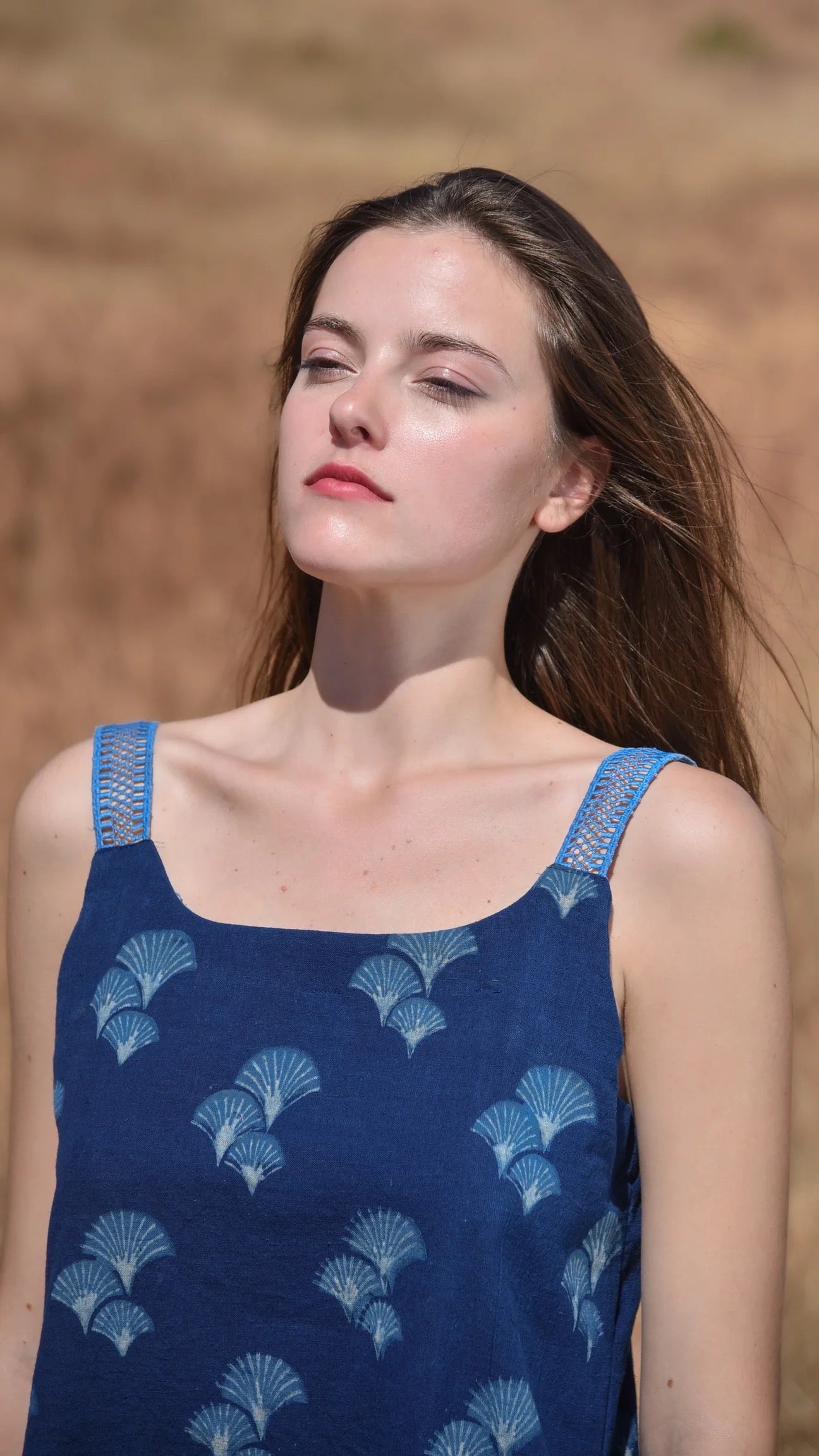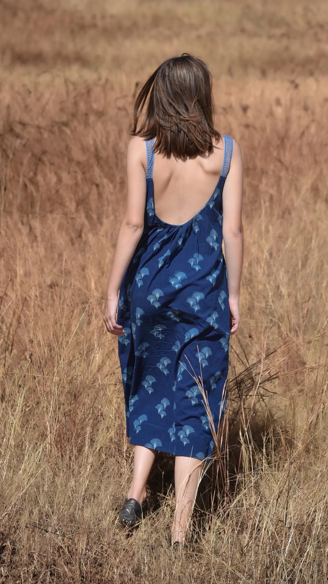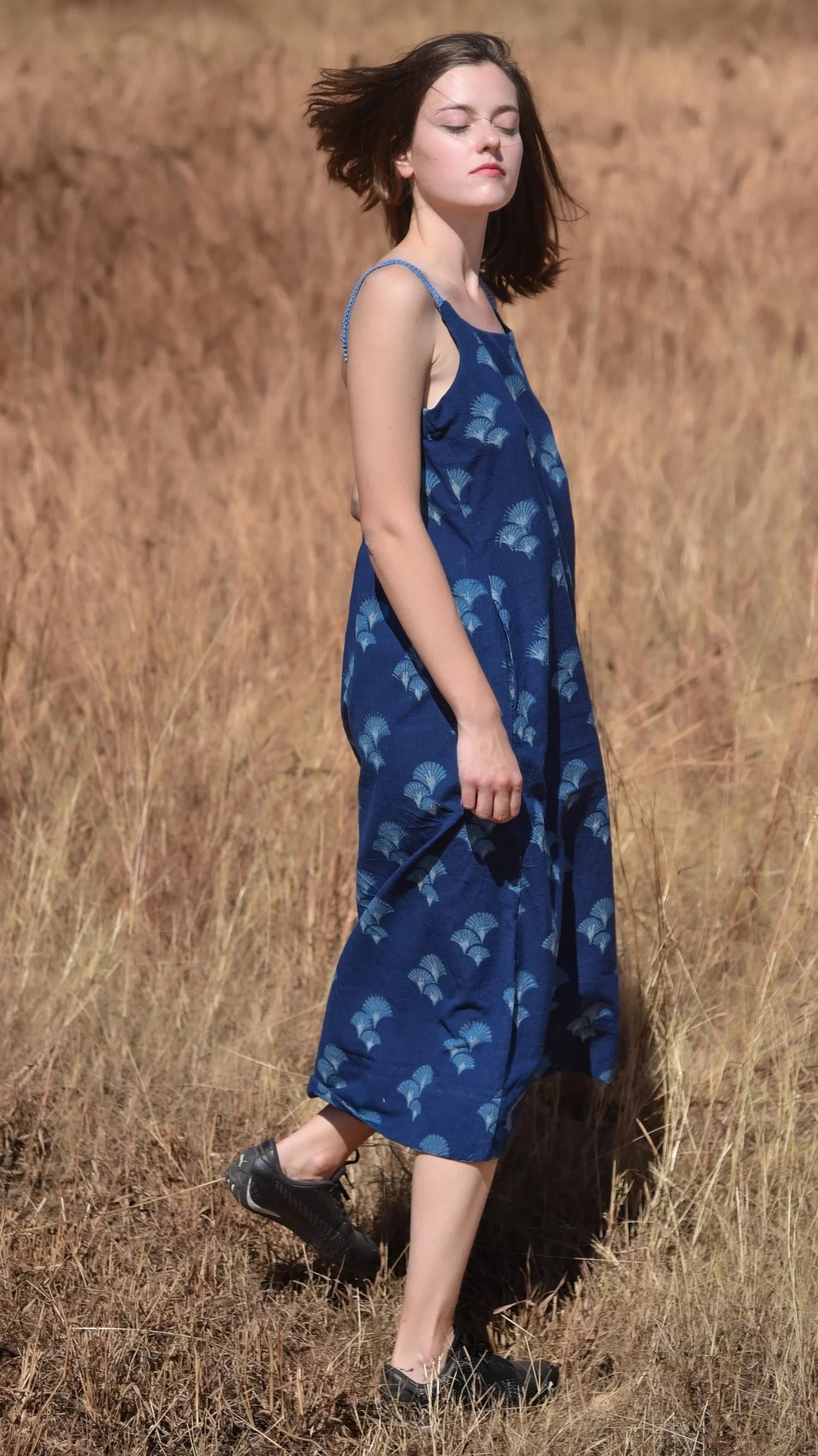 This indigo-dyed Dabu hand block printed cotton maxi dress combines effortless style with comfort. Featuring a sleeveless design and round neck, it offers a chic scooped back with delicate crochet-lace straps for a touch of elegance. The addition of pockets adds functionality, while the fully lined interior ensures all-day comfort. Perfect for warm days, this dress is a beautiful blend of artisanal craftsmanship and contemporary fashion, making it a versatile piece for any wardrobe.