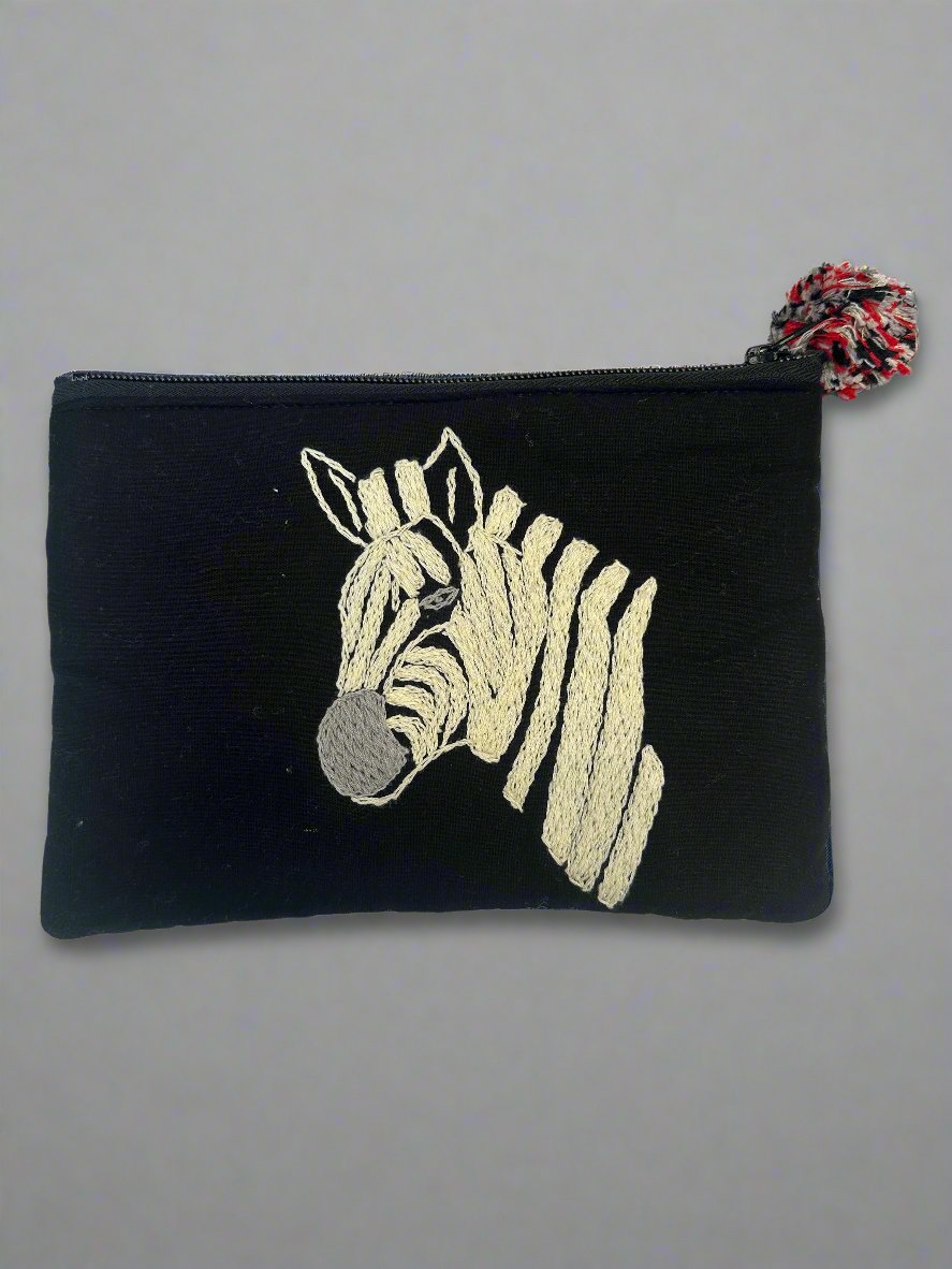 Embroidered Zebra pattern pouch with another zipper pocket inside, perfect to keep your essentials like keys, jewellery, coins etc.